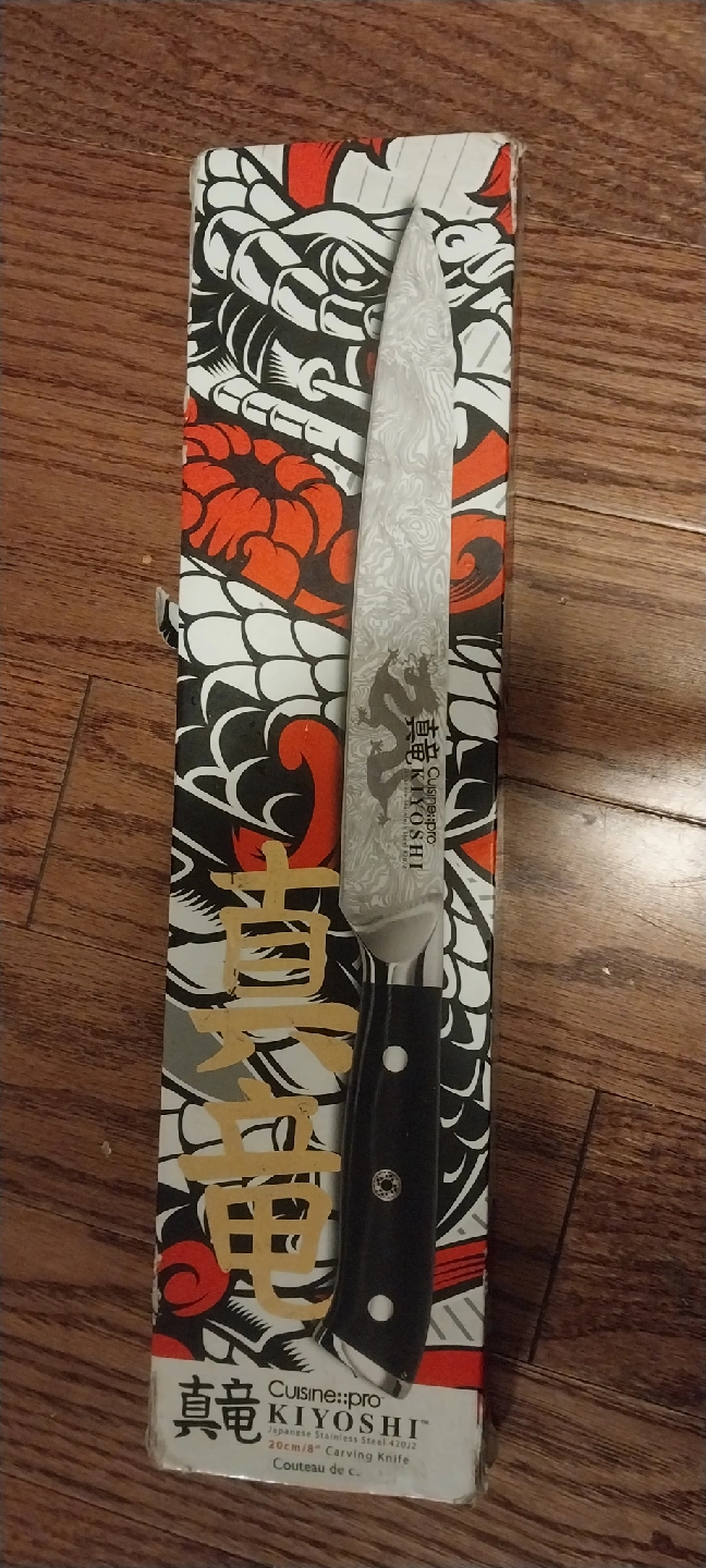 144Selling a Cuisine::pro Kiyoshi 20cm carving knife. It comes in its original box. The blade features a distinctive dragon design. It's a great knife for any chef!