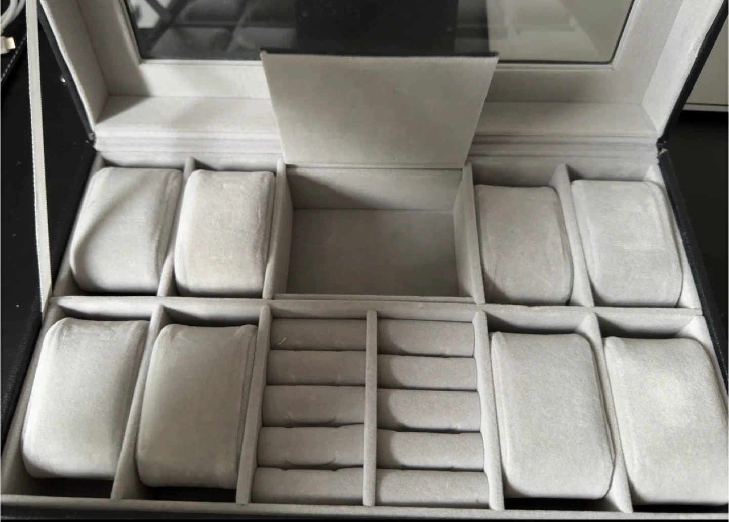 Keep your watches and jewelry organized with this stylish black leather box! It features multiple compartments for watches, rings, and other accessories. The interior is lined with soft, light grey velvet to protect your valuables. The box has a glass top so you can easily see your collection.