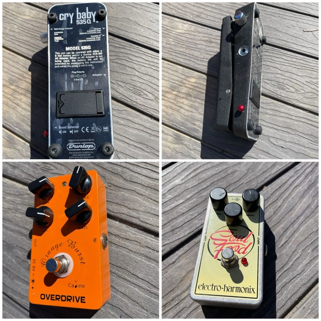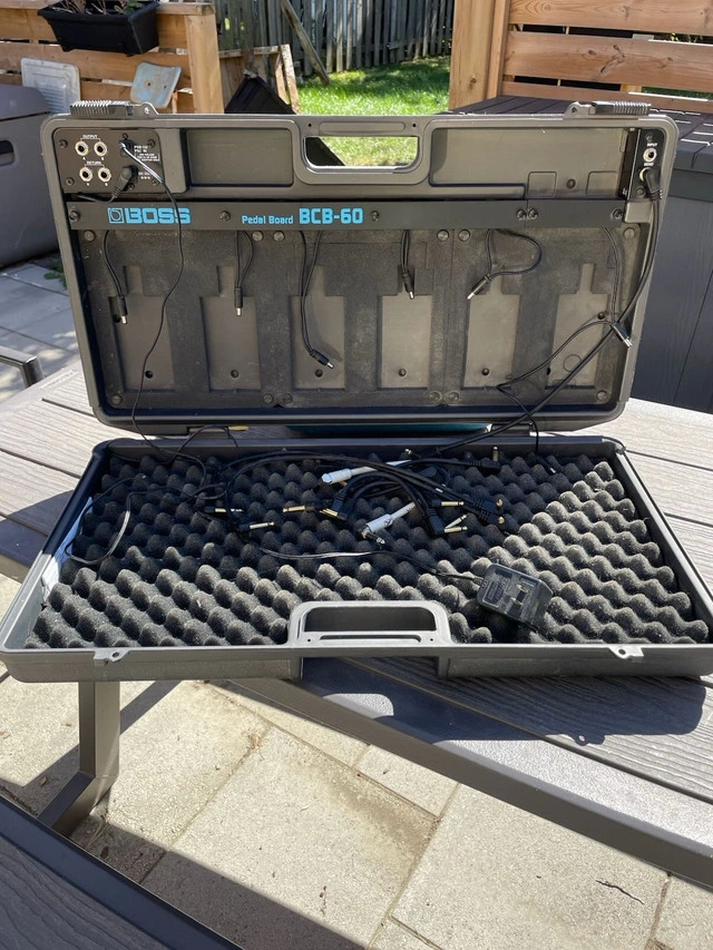 128I'm selling a used but well-maintained Boss BCB-60 pedal board, complete with a selection of guitar effect pedals. The set includes a Boss Digital Delay DD-7, a Dunlop Cry Baby 535Q wah pedal, a Caroline Guitar Company Orange Boost Overdrive, an Electro-Harmonix Good Vibes, a Boss Compression Sustainer CS-3, a Boss Loop Station RC-3, a Boss Chromatic Tuner TU-3, and a Boss Turbo Distortion DS-2. All pedals are in good working condition. Specifications: * Boss BCB-60 Pedal Board with power supply and cabling. * Variety of effects: delay, wah, overdrive, vibe, compression, looping, tuning, and distortion. It is to be sold as a set. Thanks!