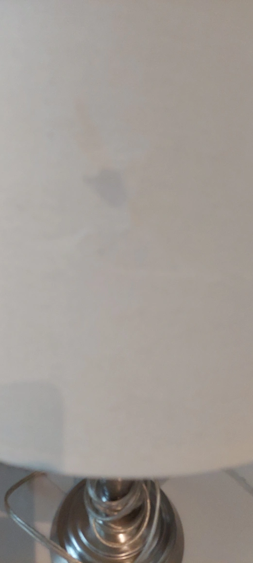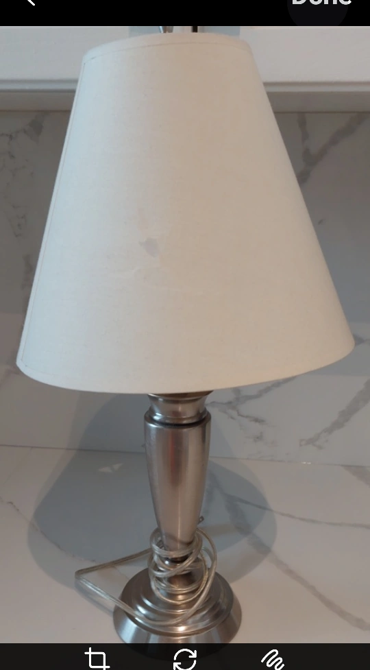 Selling a table lamp with a beige shade and silver base. It's in good condition and perfect for adding a touch of light to any room. Please note there is a small crack on the inside of the shade. But that does not affect it at all. Please see picture.