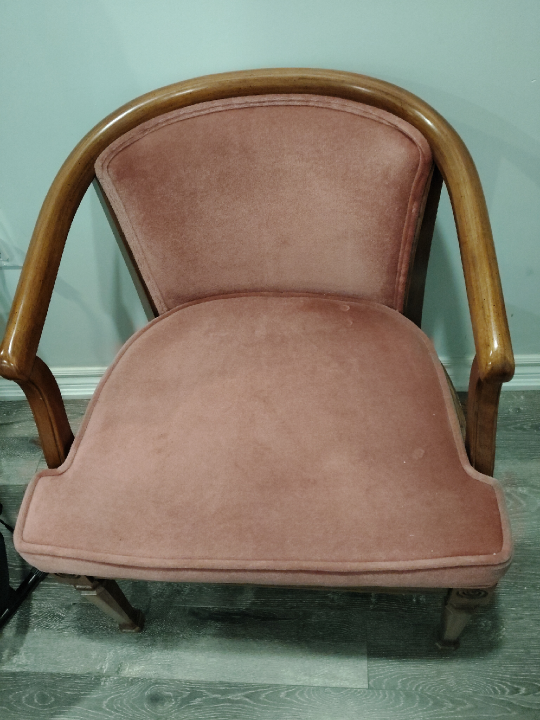 Giving away this is a lovely vintage armchair with a unique design. It features a curved wood frame and soft pink upholstery. It would be a great addition to any room!
