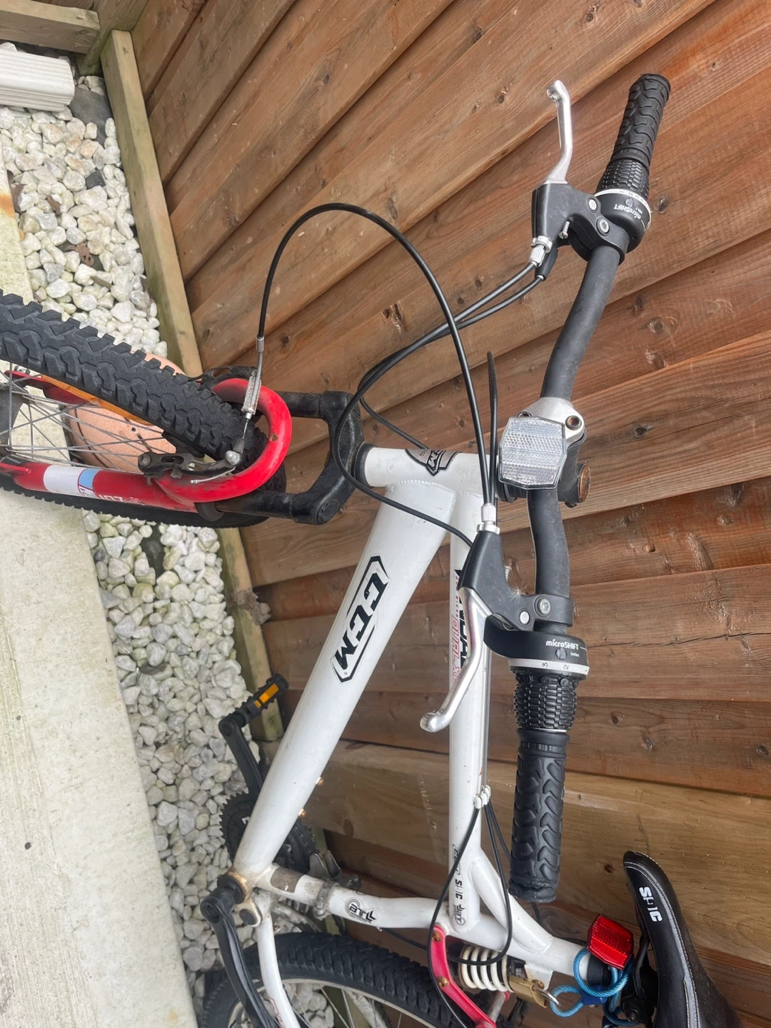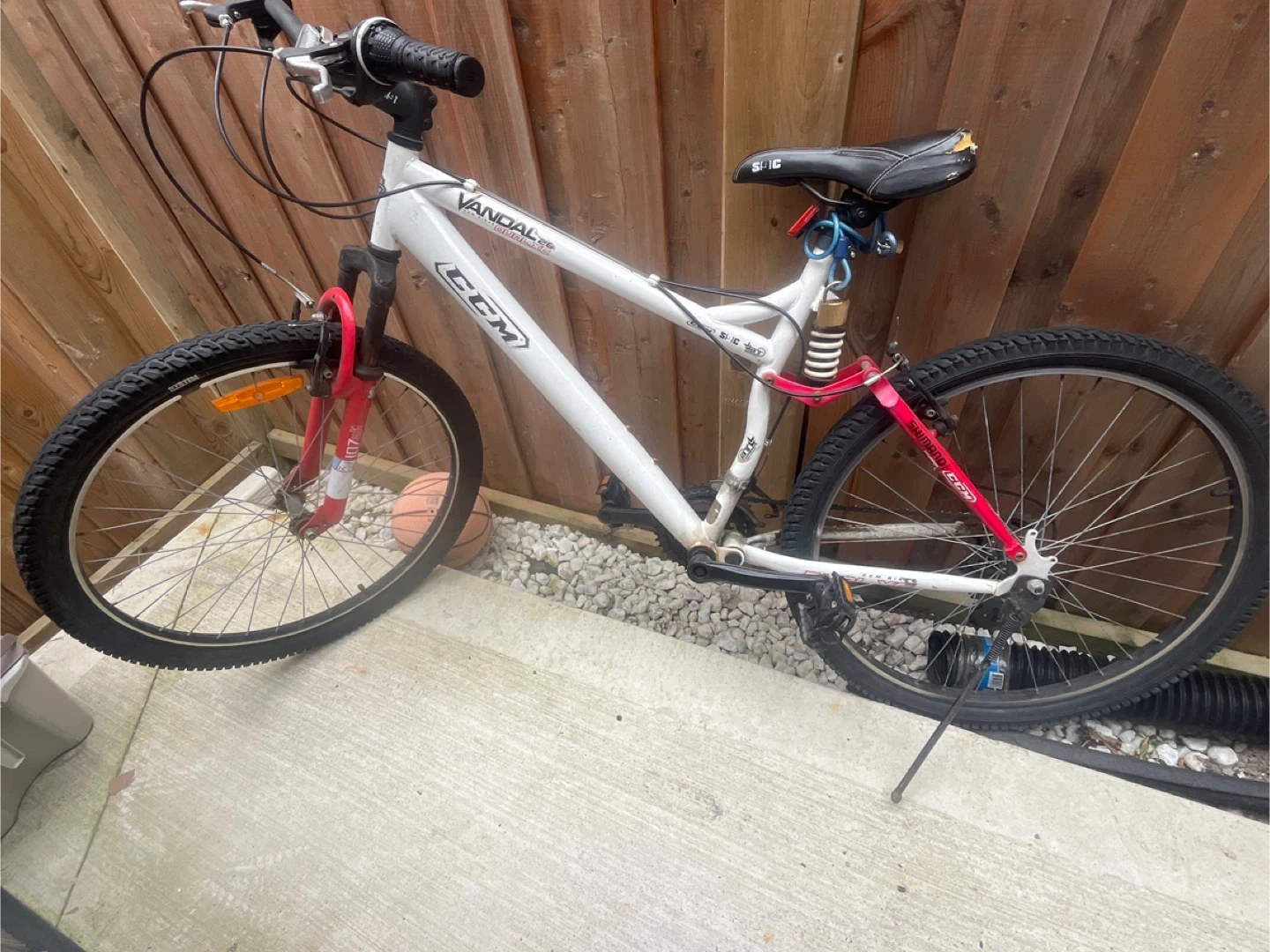 Selling a CCM Vandal 26" mountain bike. It's white with red accents. Great for trails or just getting around town!