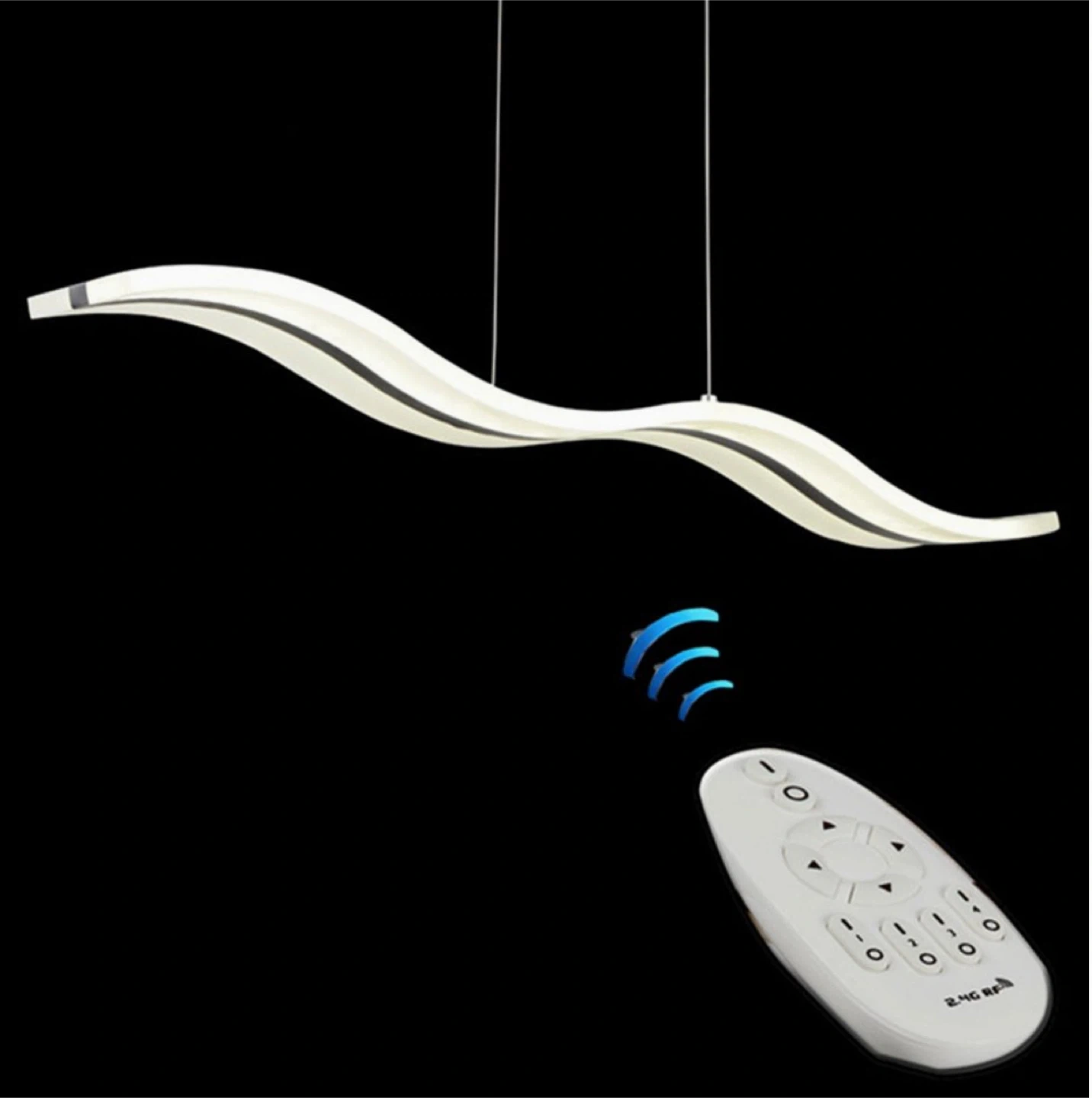 Add a touch of modern elegance to your home with this stylish LED wave ceiling light fixture! It features a sleek, wavy design and adjustable suspension wires. The dimensions are approximately 39 inches in length, 4.73 inches in width, and adjustable up to 59 inches in height. It also comes with a remote control