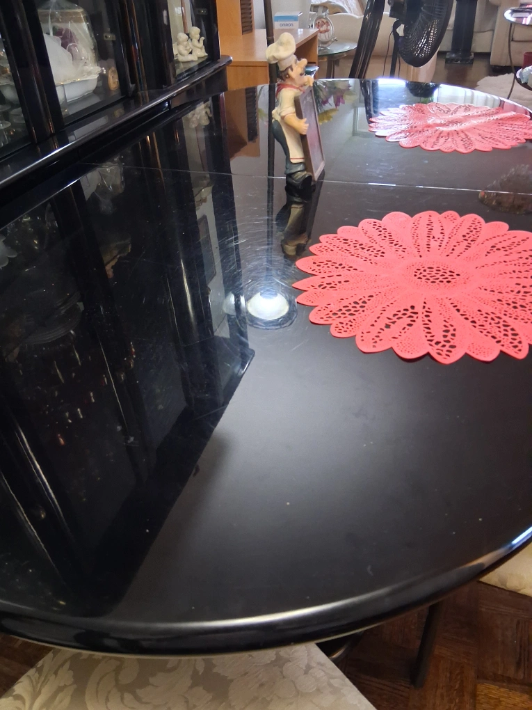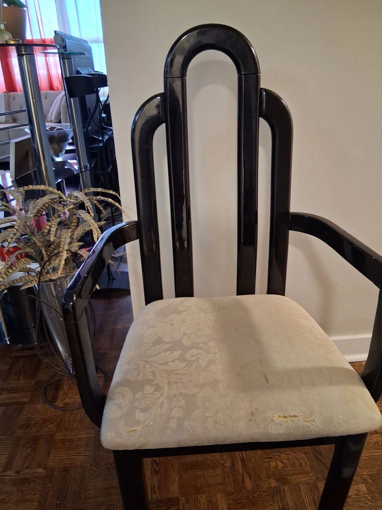 Selling a dining table with four chairs. The table is black piano finish and round, no leaf. The chairs have a floral pattern on the seat. The chairs show some wear and tear.