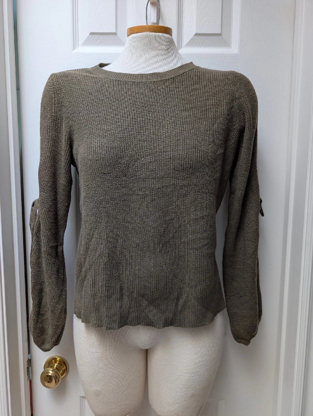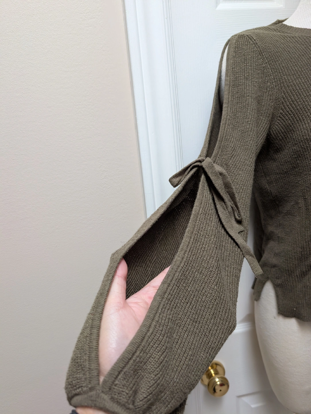 Cozy American Eagle Outfitters sweater in a neutral olive green colour. It has a unique sleeve detail with tie closures. Size medium. Porch Pick up Ajax Church and Delaney Please see My profile for more items