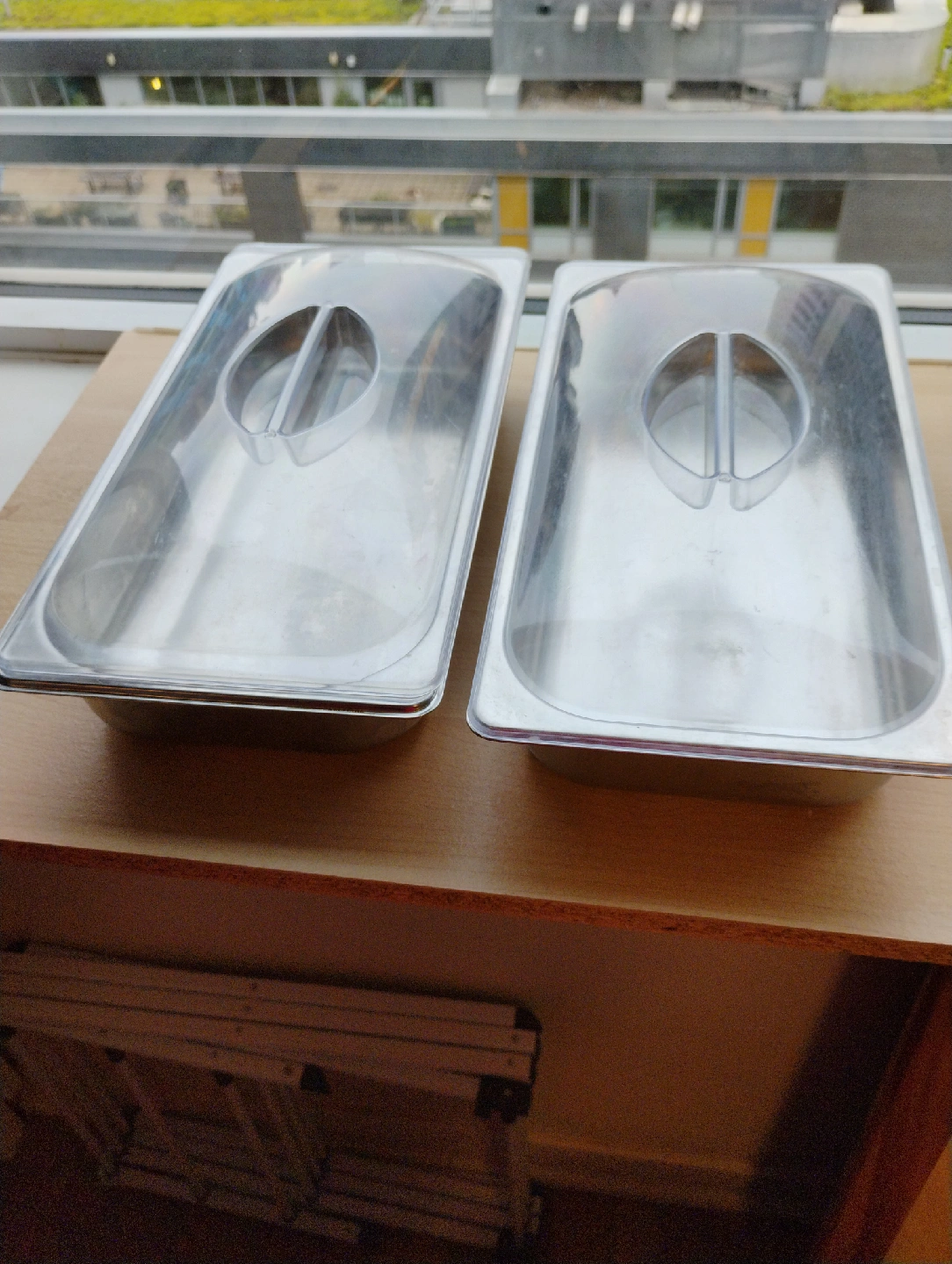 53Two stainless steel food trays, each complete with its own lid! These are perfect for catering, buffets, or even just keeping food fresh at home. They're durable and easy to clean, making them a great addition to any kitchen or serving setup