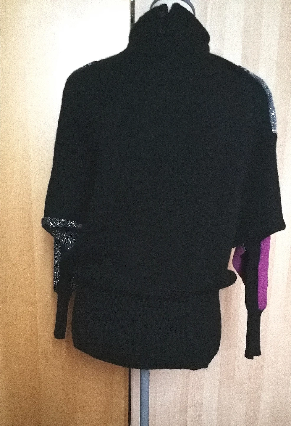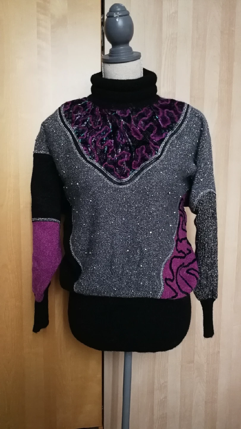 Vintage colour block kidmohair blend turtleneck long sweater, size S, made in Italy. It features bat sleeves, black, grey, and purple detailing with embellishments, it's in very good condition. Serious inquiries please pick up in downtown close to St Patrick station, Dundas-University area