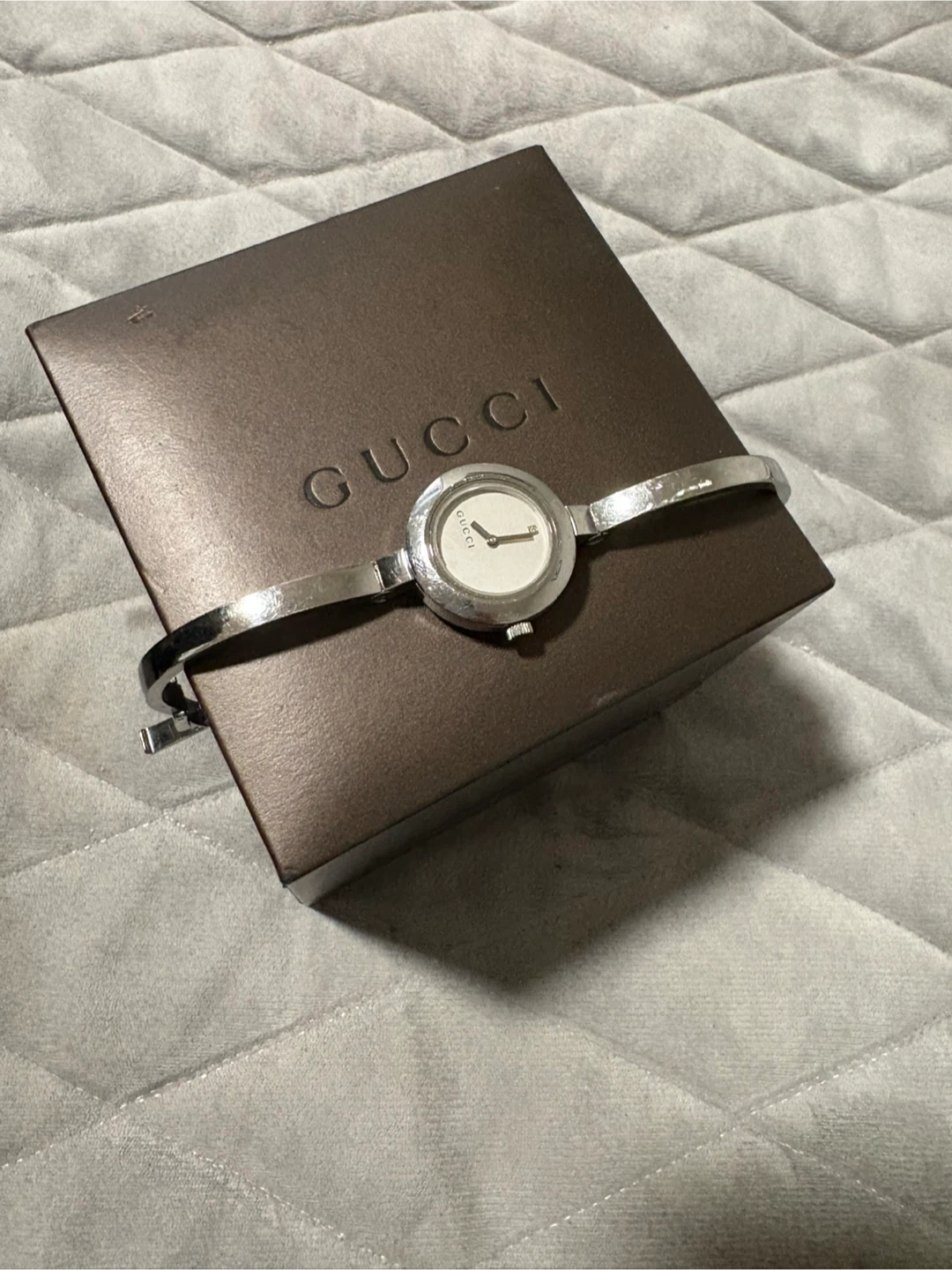 10Selling a lovely vintage Gucci bangle watch! It comes with its original box. The watch is in good condition and has a unique and stylish design. Perfect for adding a touch of elegance to any outfit!