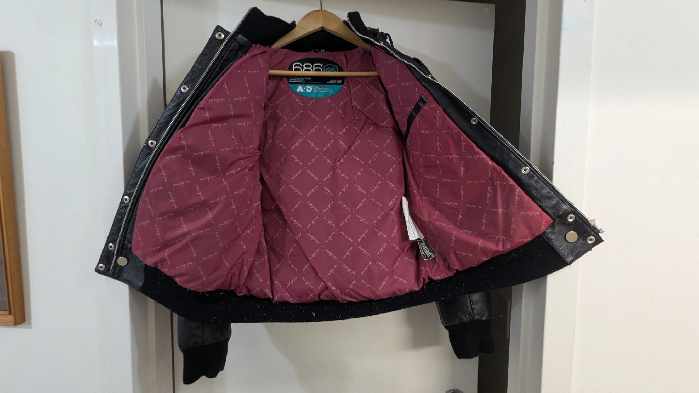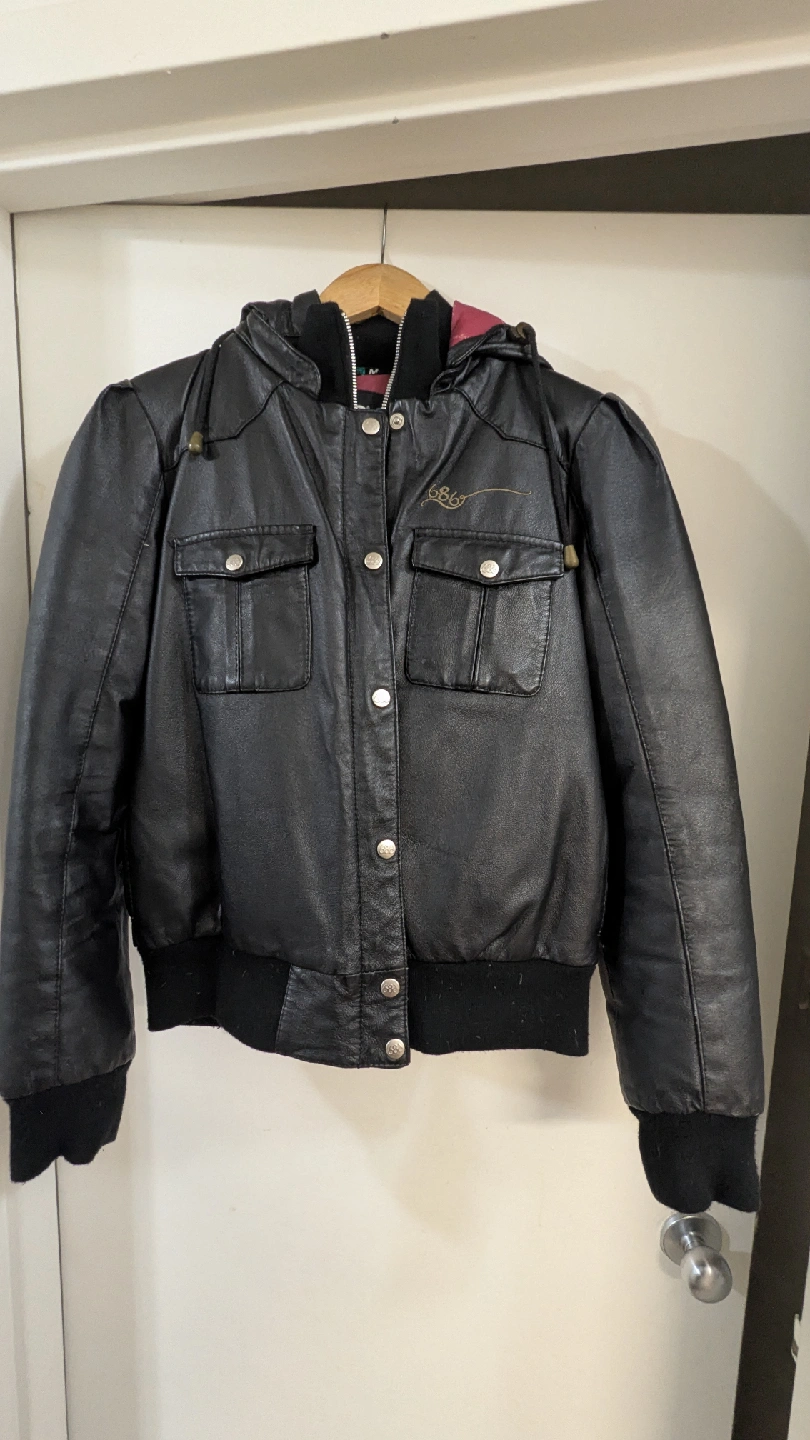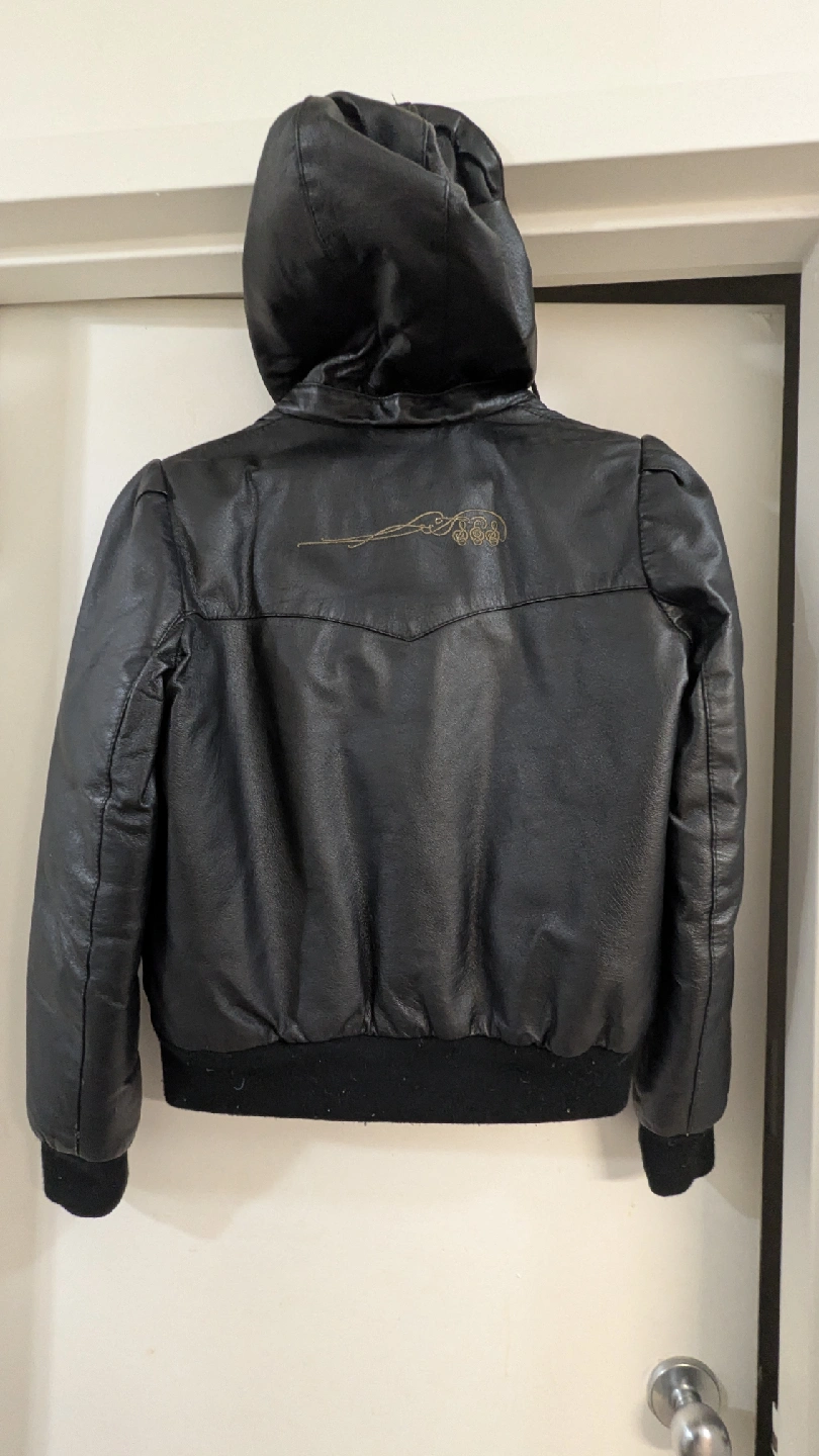 36Selling a stylish black leather hooded jacket from 686! It's in great condition and made with high-quality materials. - Shell: 100% Leather - Lining: 100% Polyester - Filling: Down & Leather Pickup near Brentwood. From smoke-free, cat friendly home.