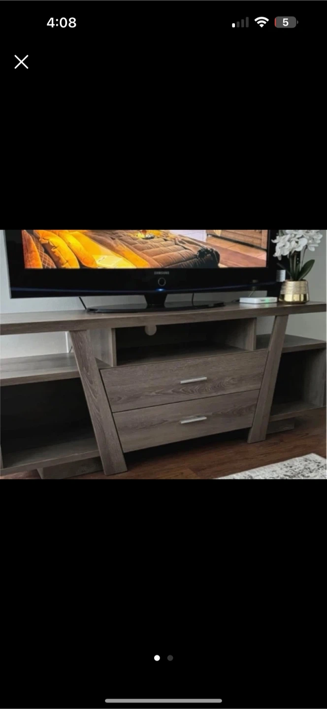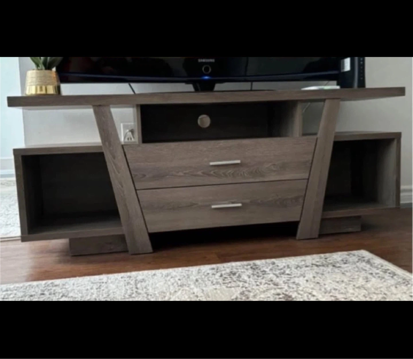 Selling a wood TV stand. It has a nice design with drawers and open shelving for storage. Perfect for your living room or entertainment area!
