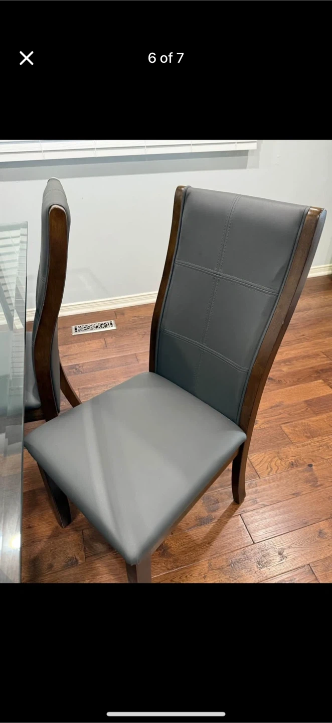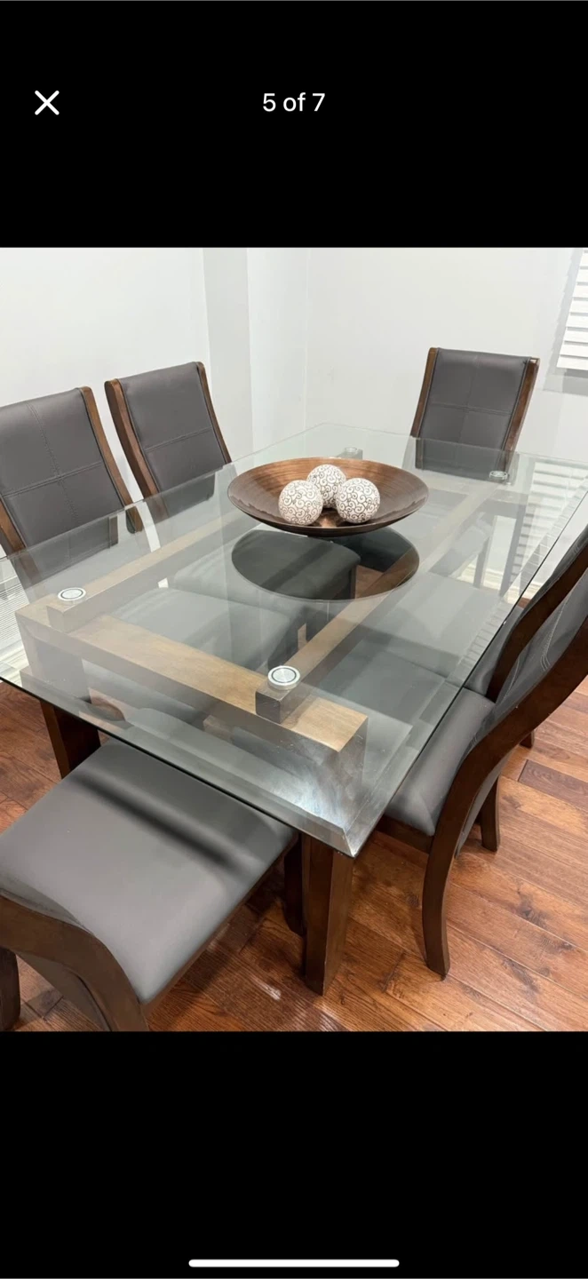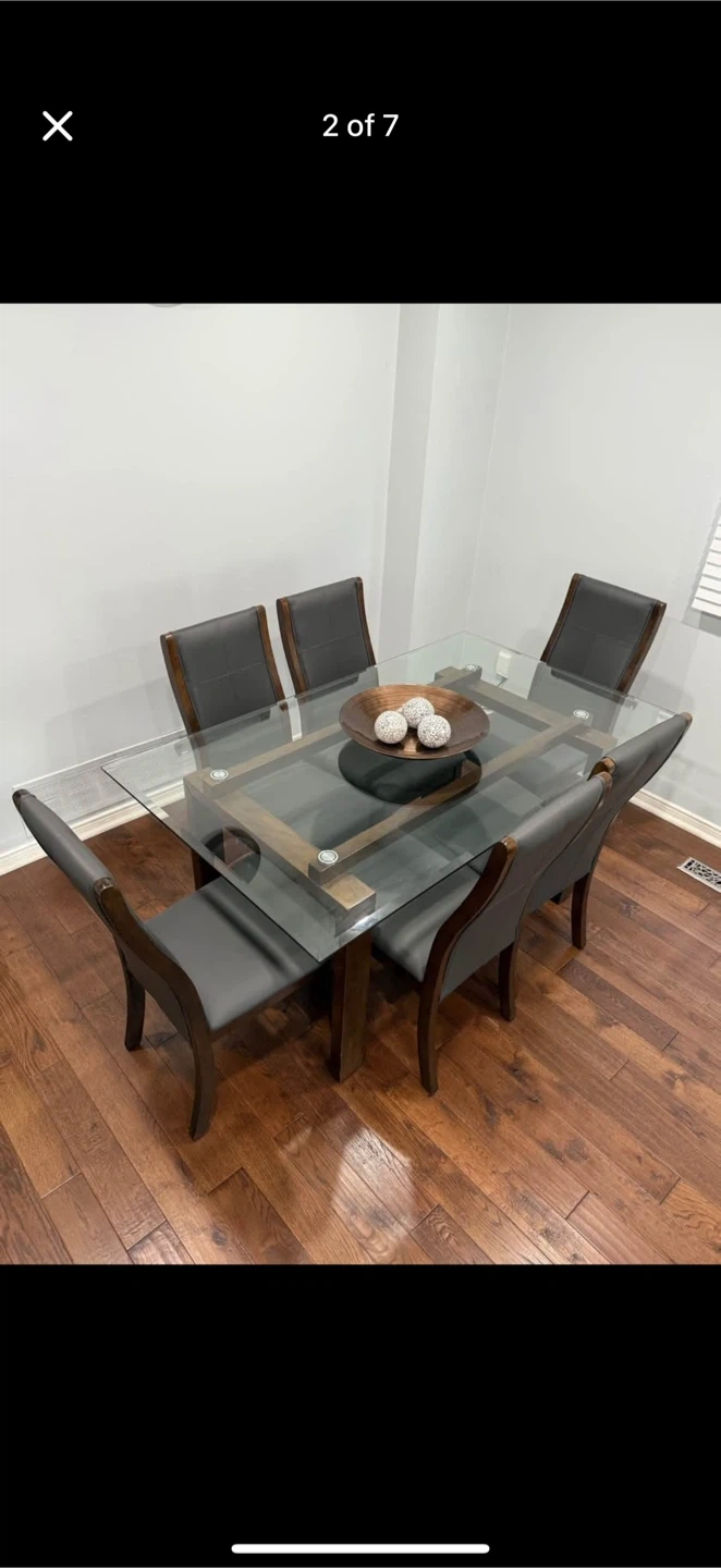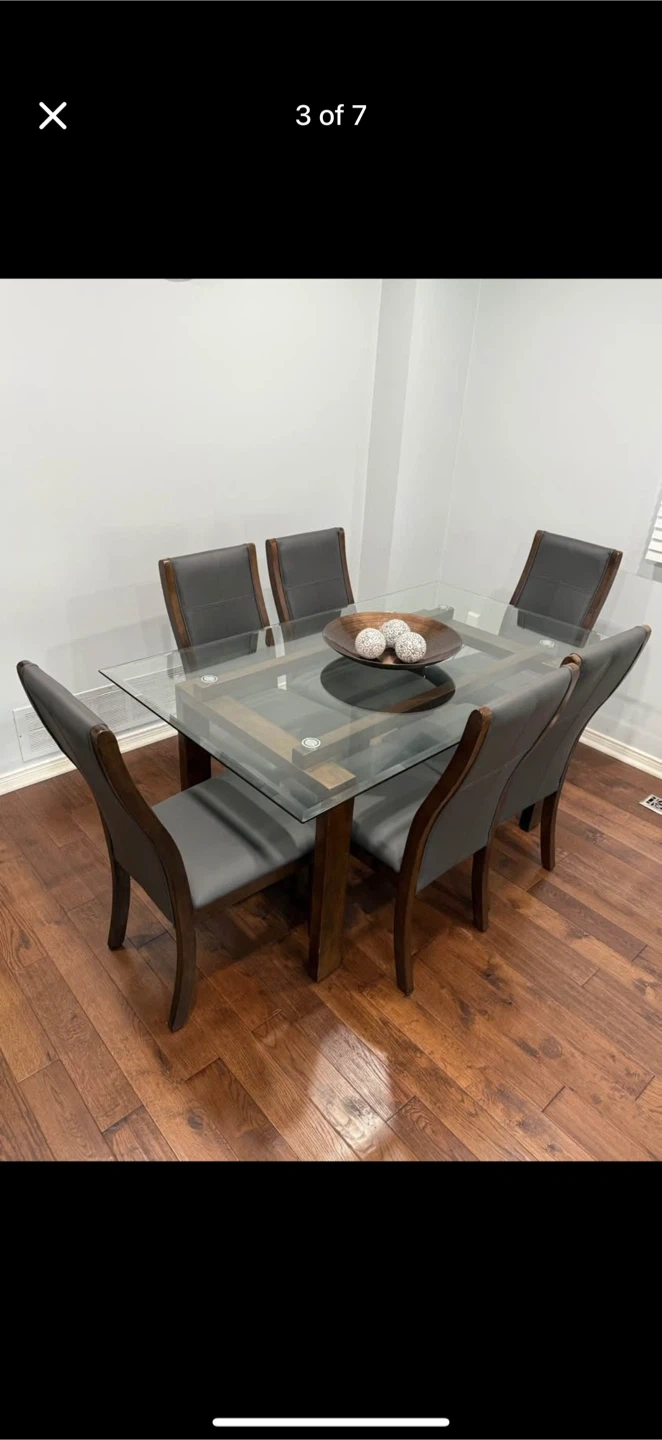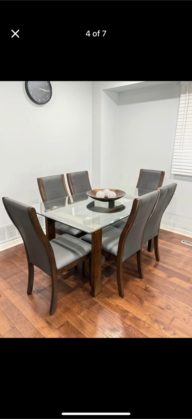 10Selling a dining table with a glass top and six matching chairs. The chairs have a dark wood frame and grey upholstered seats. The table has a unique design with a wooden base and a clear glass top. It's in good condition and ready for a new home!