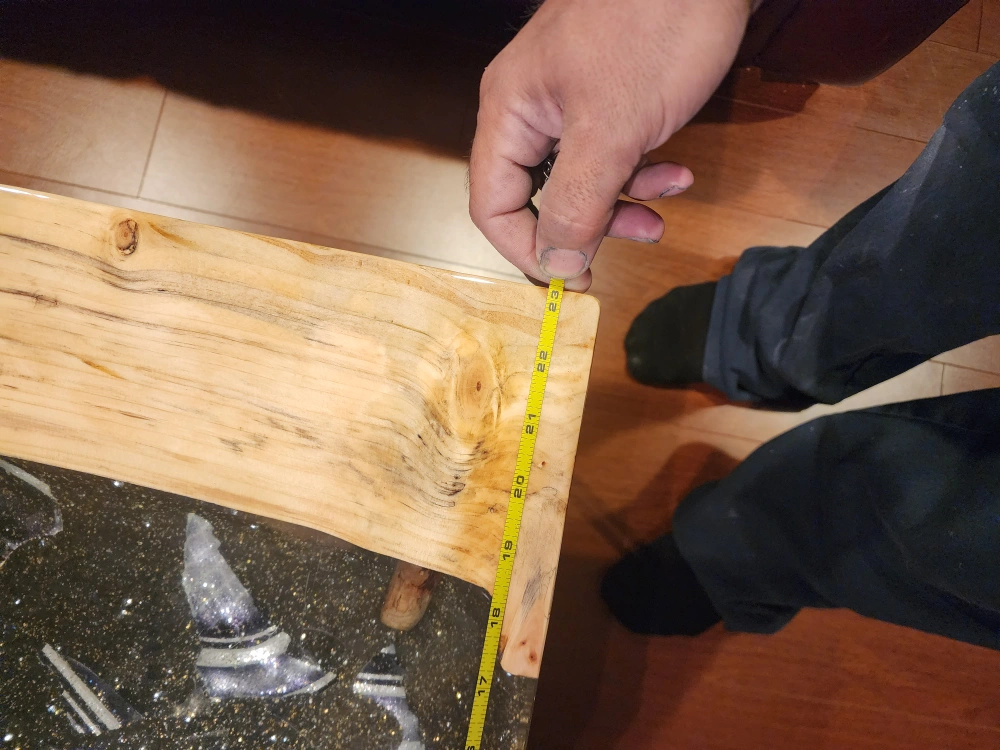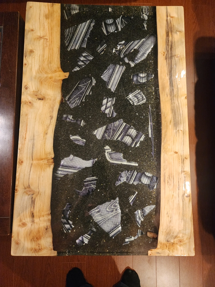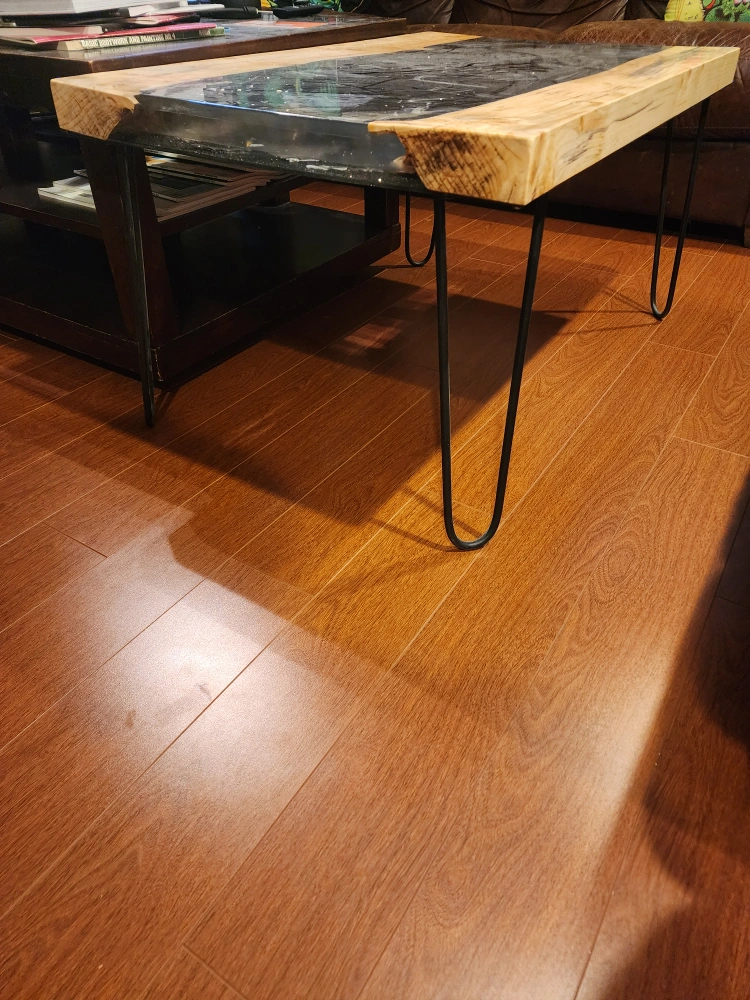 hand made epoxy river coffee table. hair pin legs. black and gold metallic and pieces of an old motorcycle paint job are in the "river" part of the epoxy. the wood is Blue Fir.
