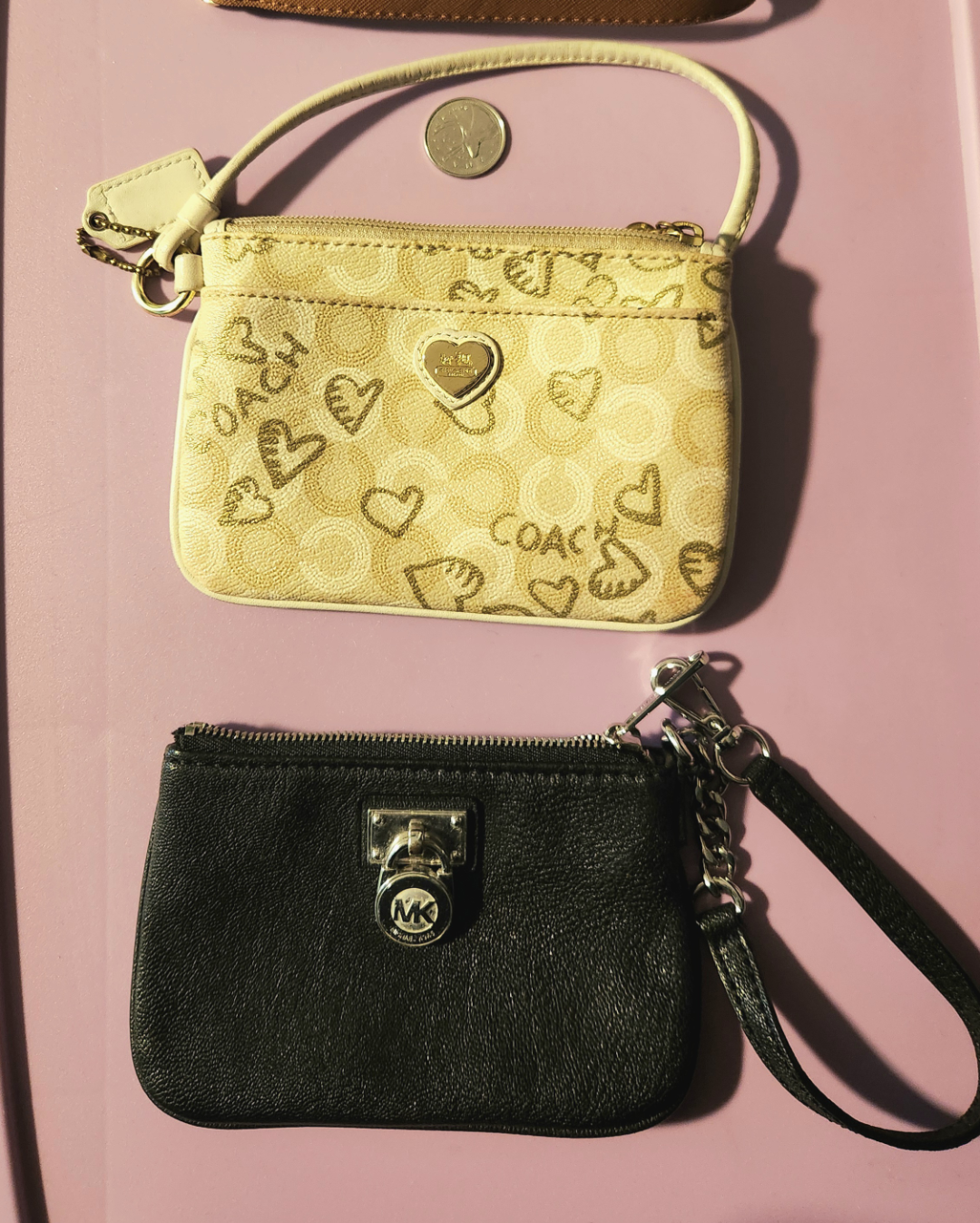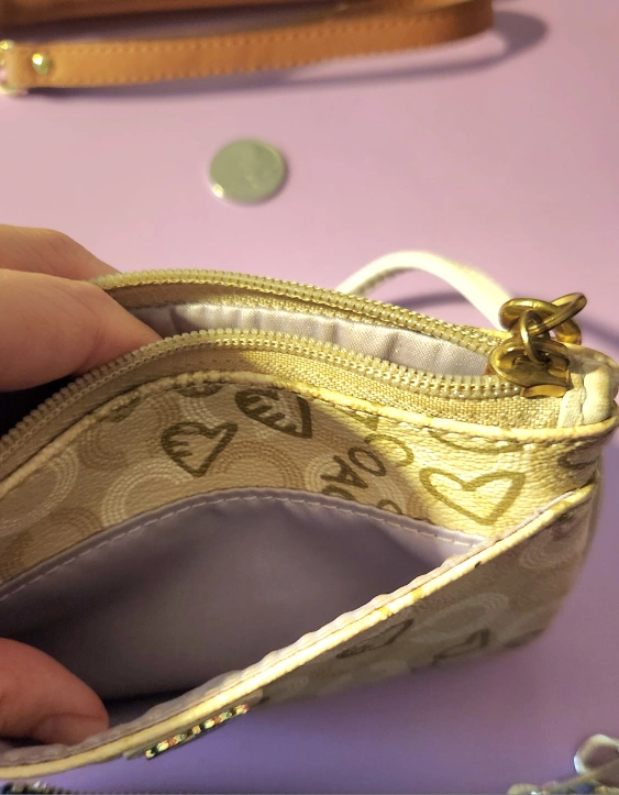 Cream & Lavender Coach Wristlet. Has 1 open compartment and 1 zipped compartment