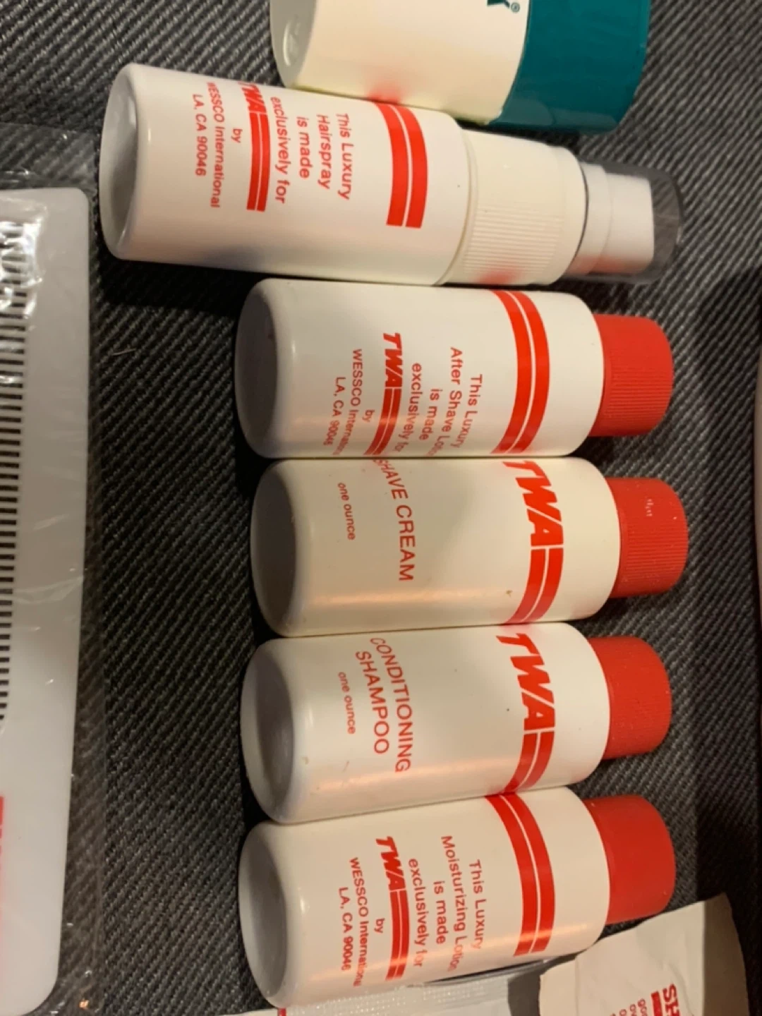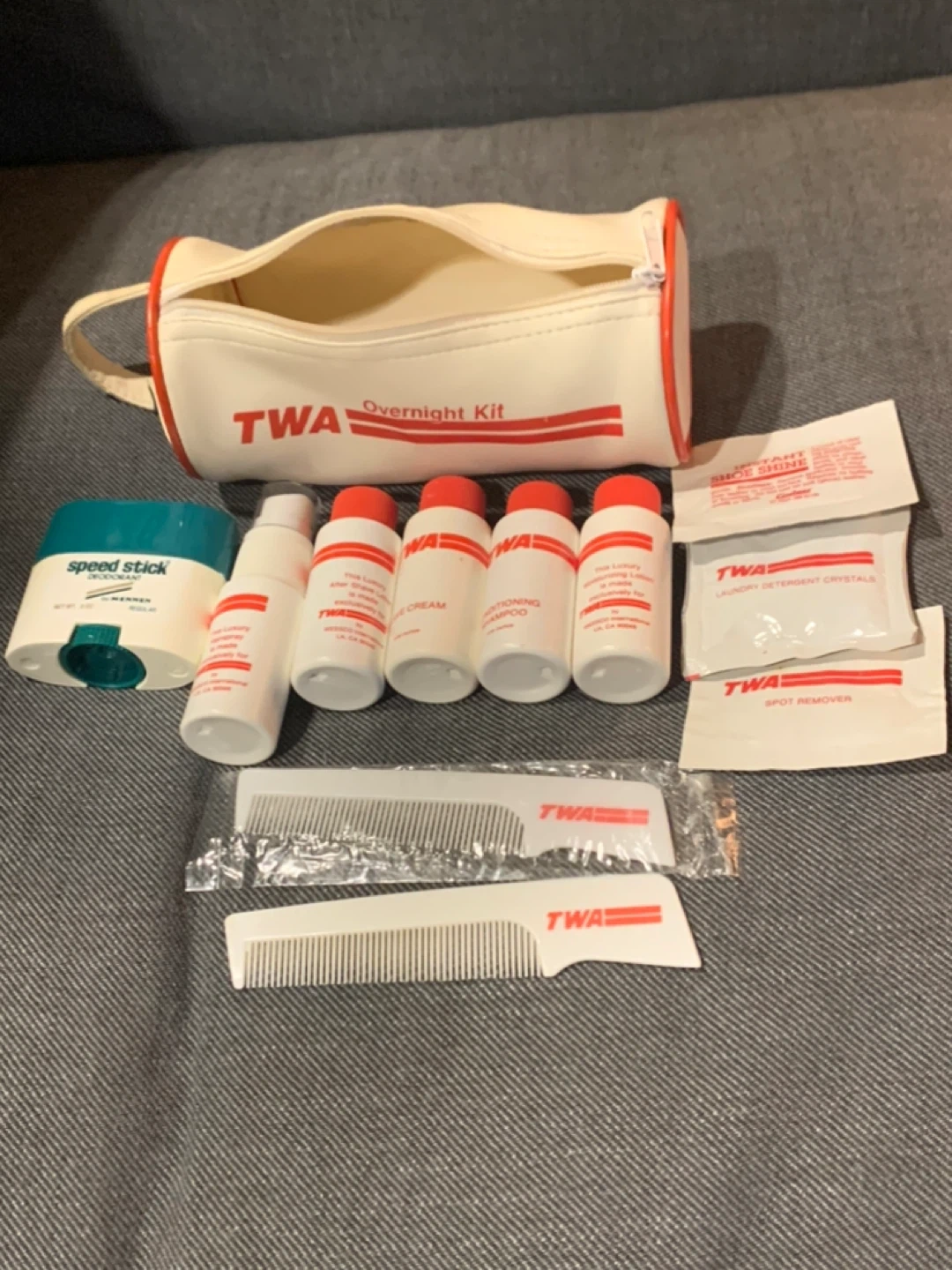 Check out this vintage TWA Overnight Kit! It includes a variety of travel-sized toiletries and accessories, all branded with the classic TWA logo. Perfect for collectors or anyone looking for a unique piece of airline history! Included are combs, creams, shampoo, and more!