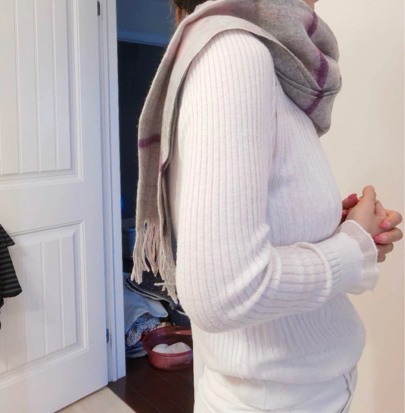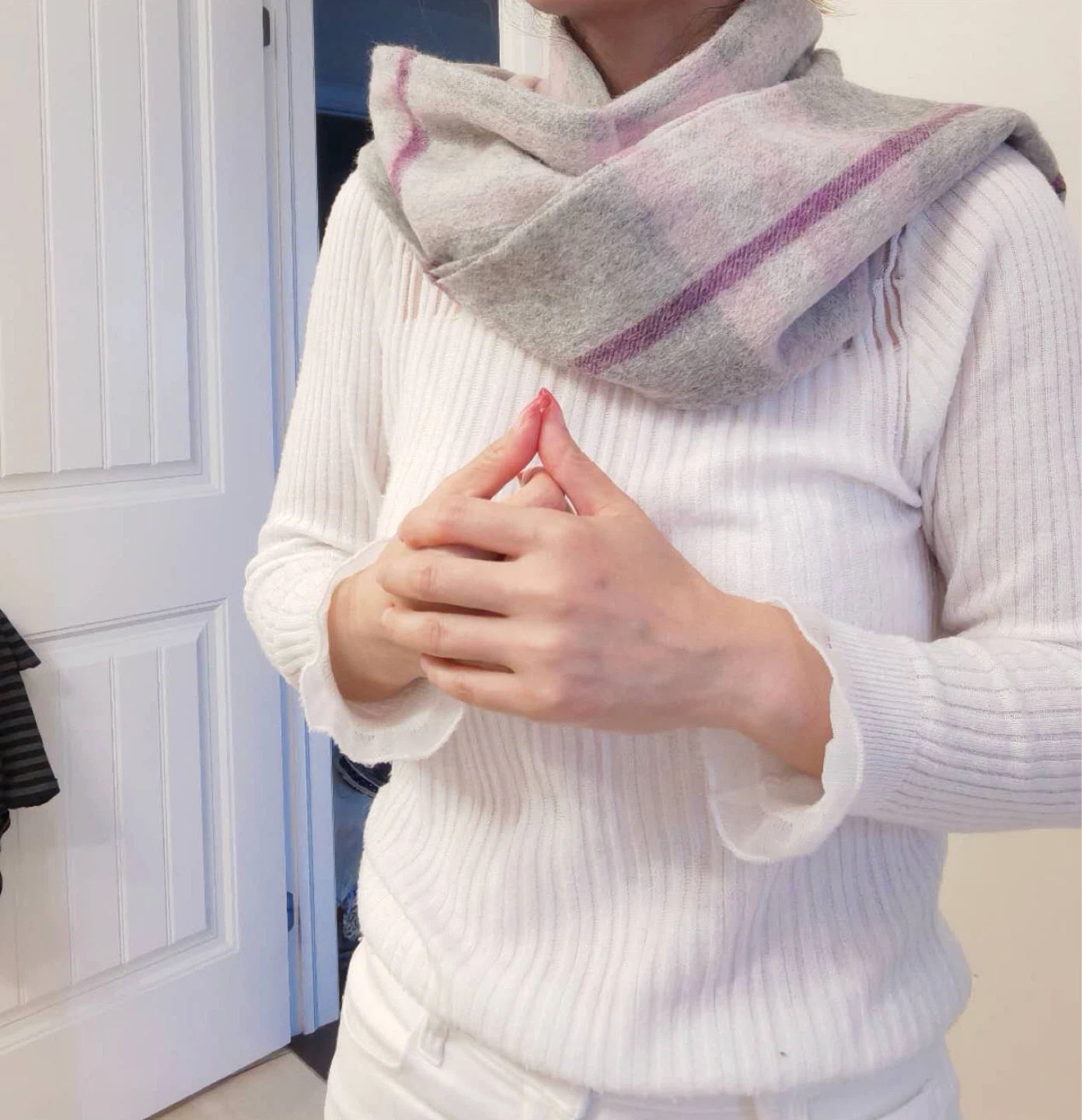 Snuggle up with this cozy scarf! It features a lovely plaid pattern in soft, warm colours. Perfect for adding a pop of colour and warmth to your winter outfits