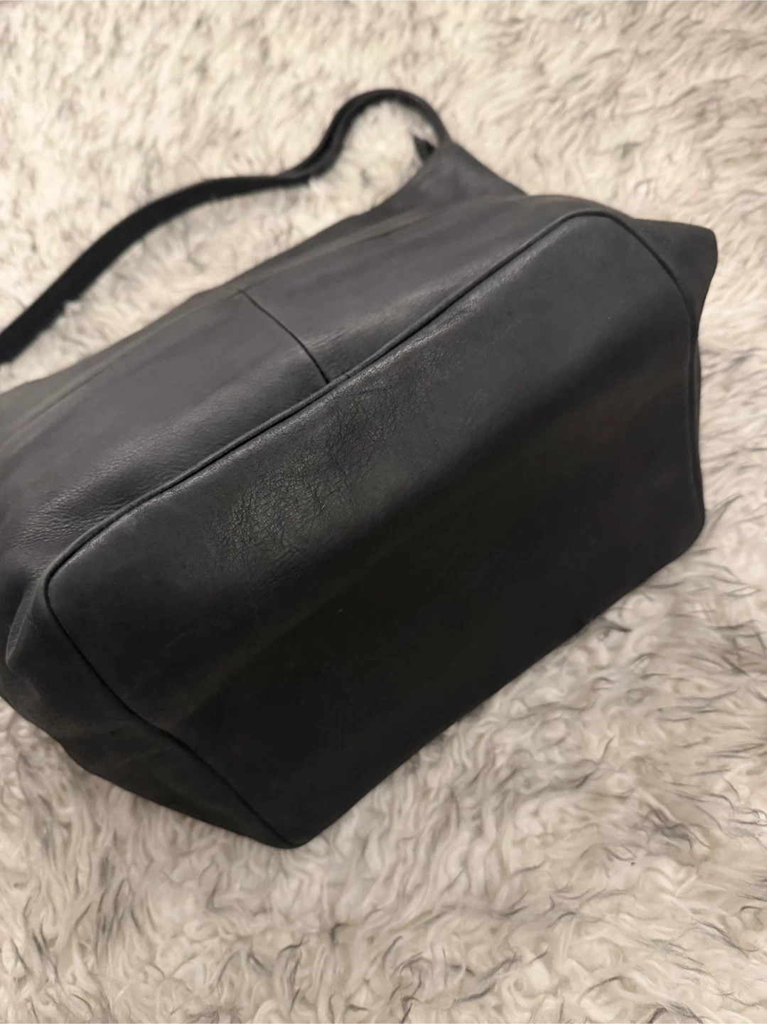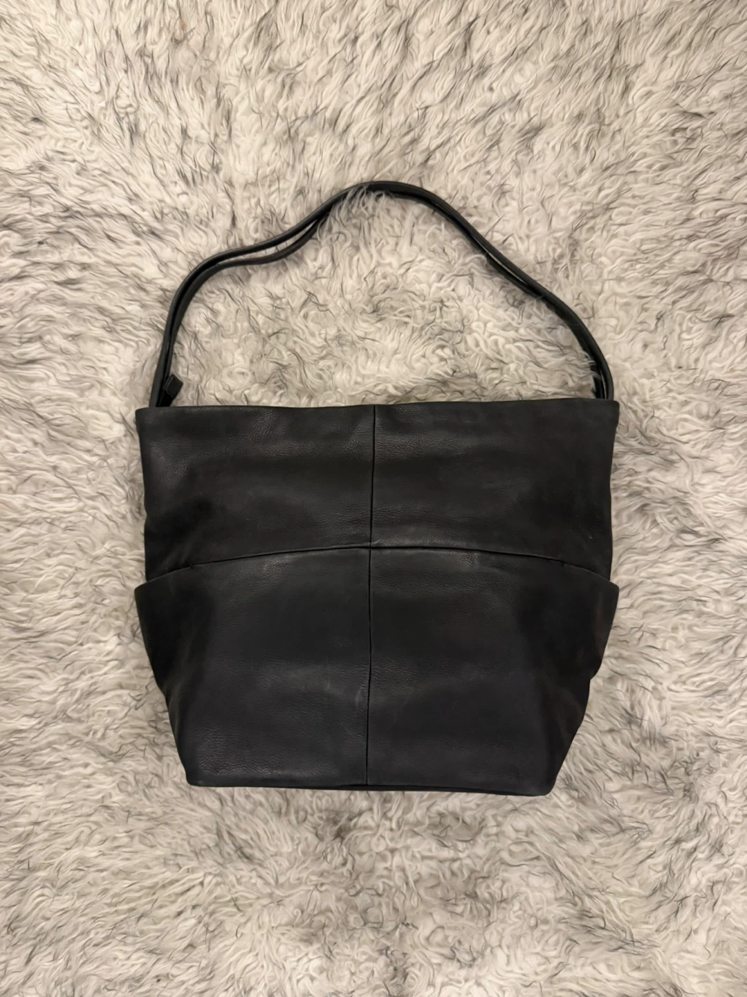 This elegant soft black leather shoulder bag is perfect for any occasion. Its sleek design and high-quality material make it a must-have accessory. It has pockets on the sides, some inside. Has loads of space.