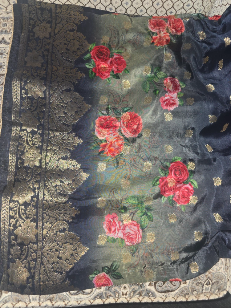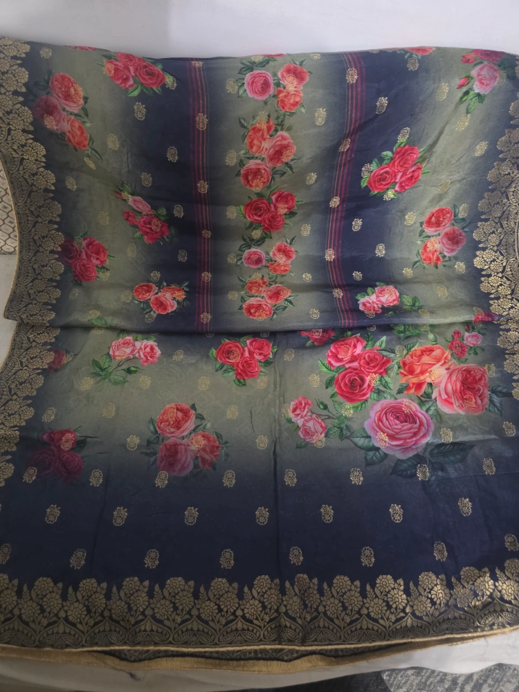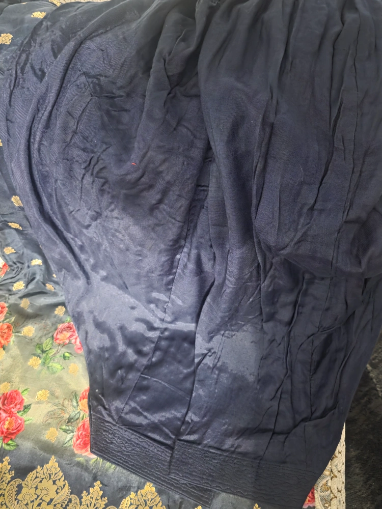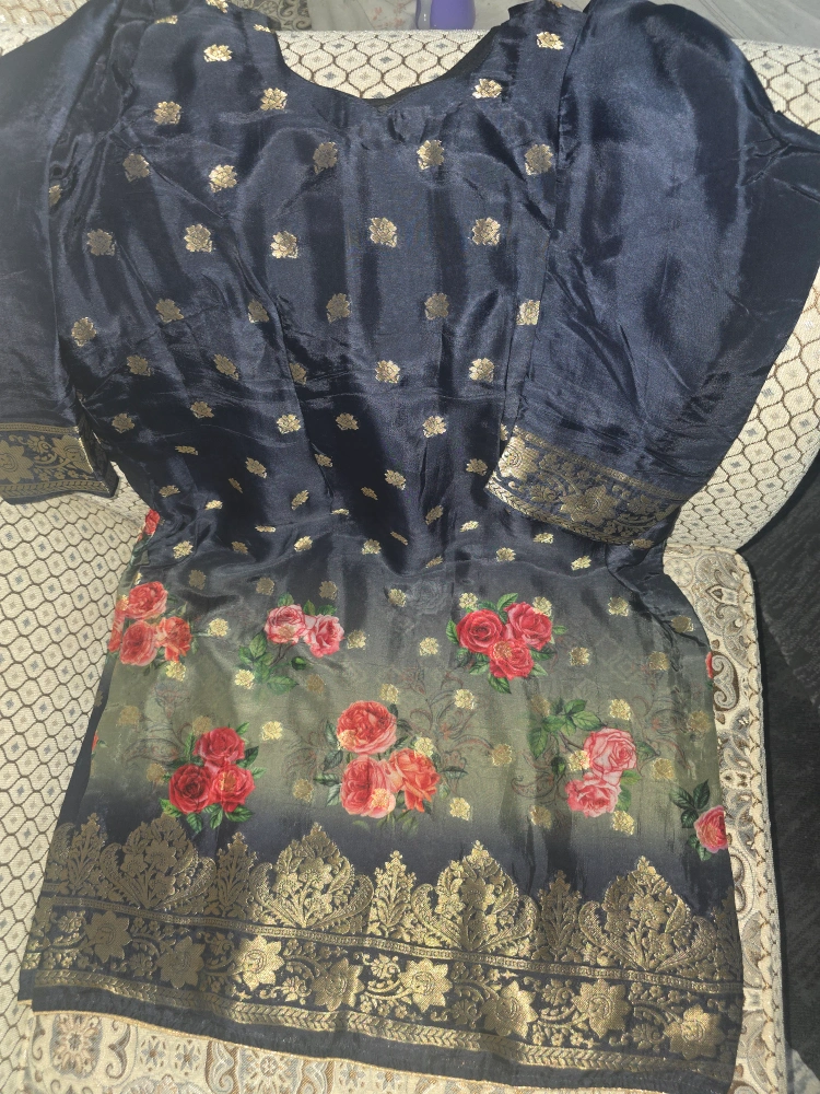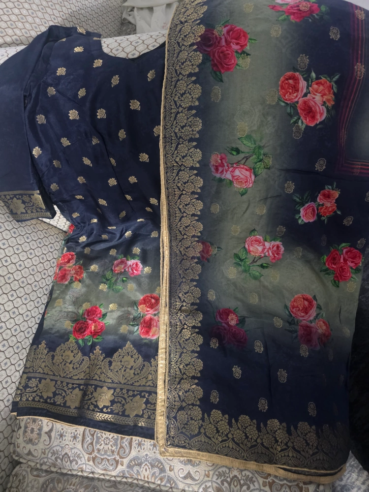 Beautiful salwar kameez suit with a lovely floral print! The set includes a tunic top, pants, and a matching dupatta. The fabric has a nice sheen and the gold detailing adds a touch of elegance. Perfect for a special occasion or everyday wear
