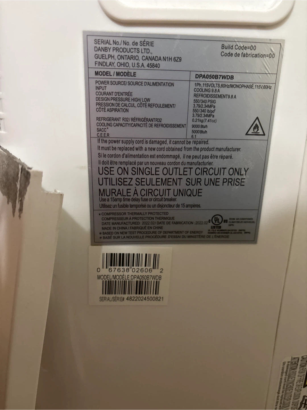 Selling a Danby 5000 BTU portable air conditioner. Model number is DPA050B7WDB. The manufacturing date is 2022 June 02. It uses refrigerant R32/RÉFRIGÉRANT R32. Serious inquiries only