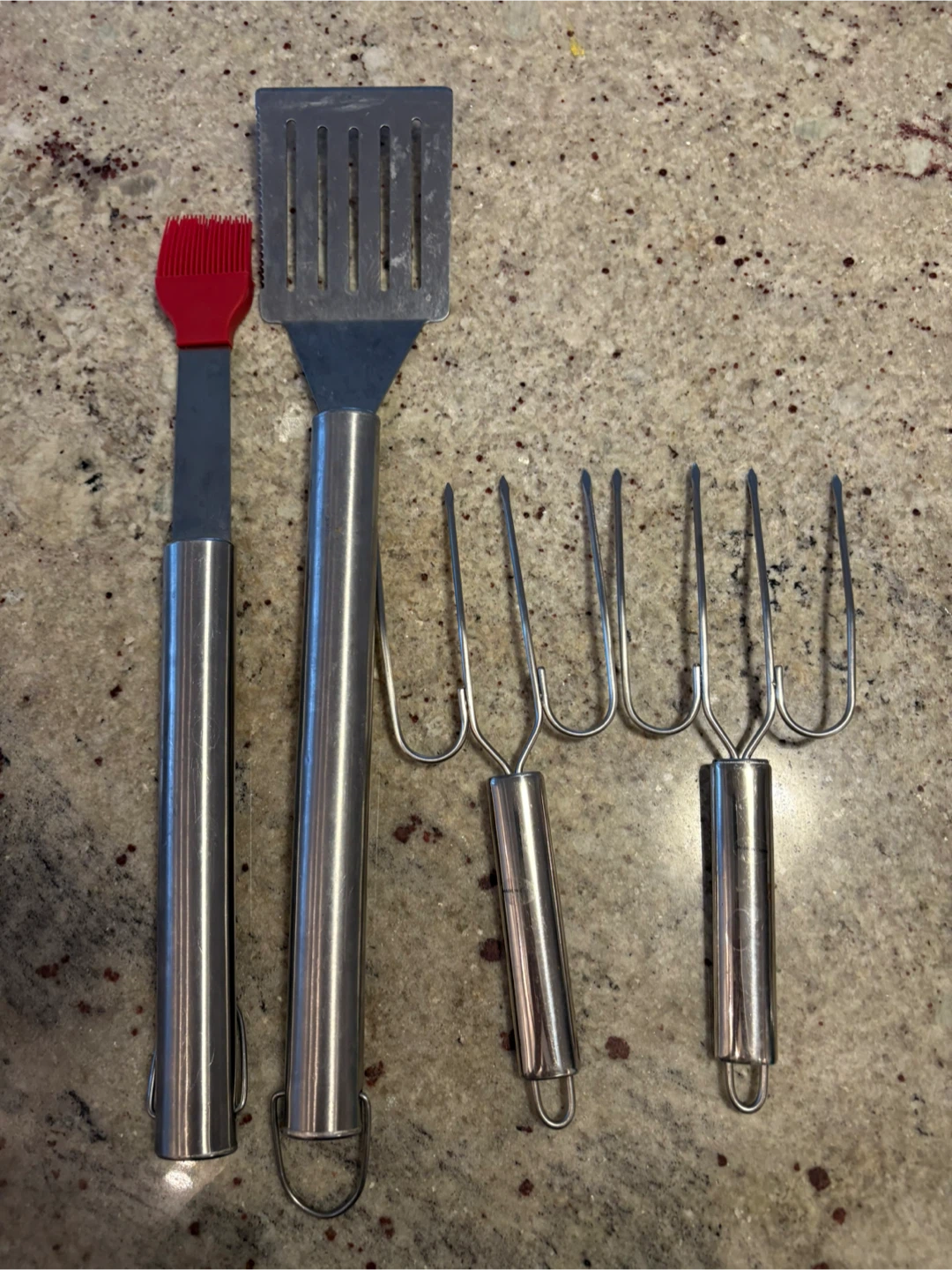 Selling a BBQ tool set including a spatula, brush, and two forks. Perfect for grilling season!