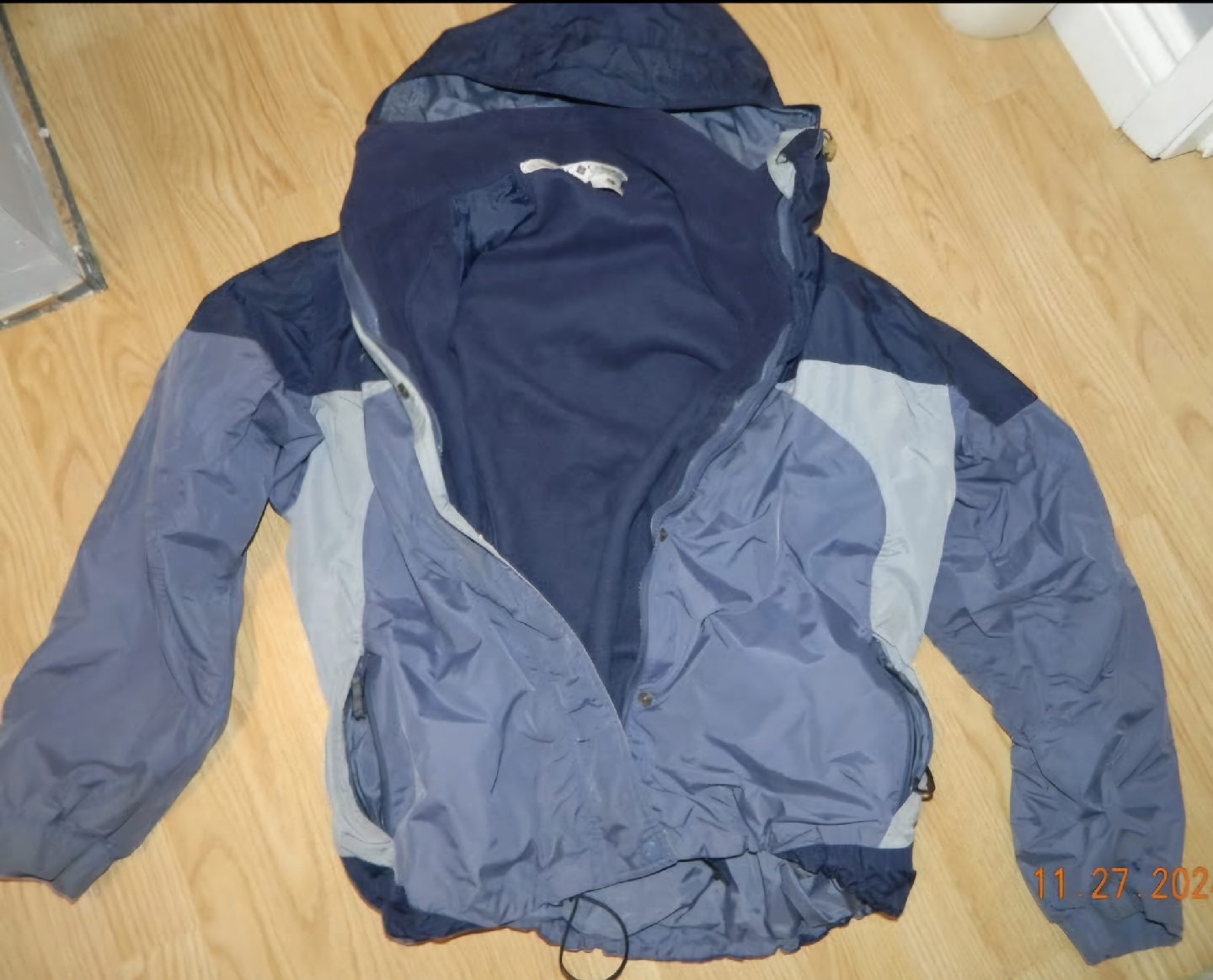I'm selling a Columbia Sportswear Company jacket in women's size large! It is blue, grey, and navy and made in Sri Lanka. Perfect for staying warm on those chilly days!