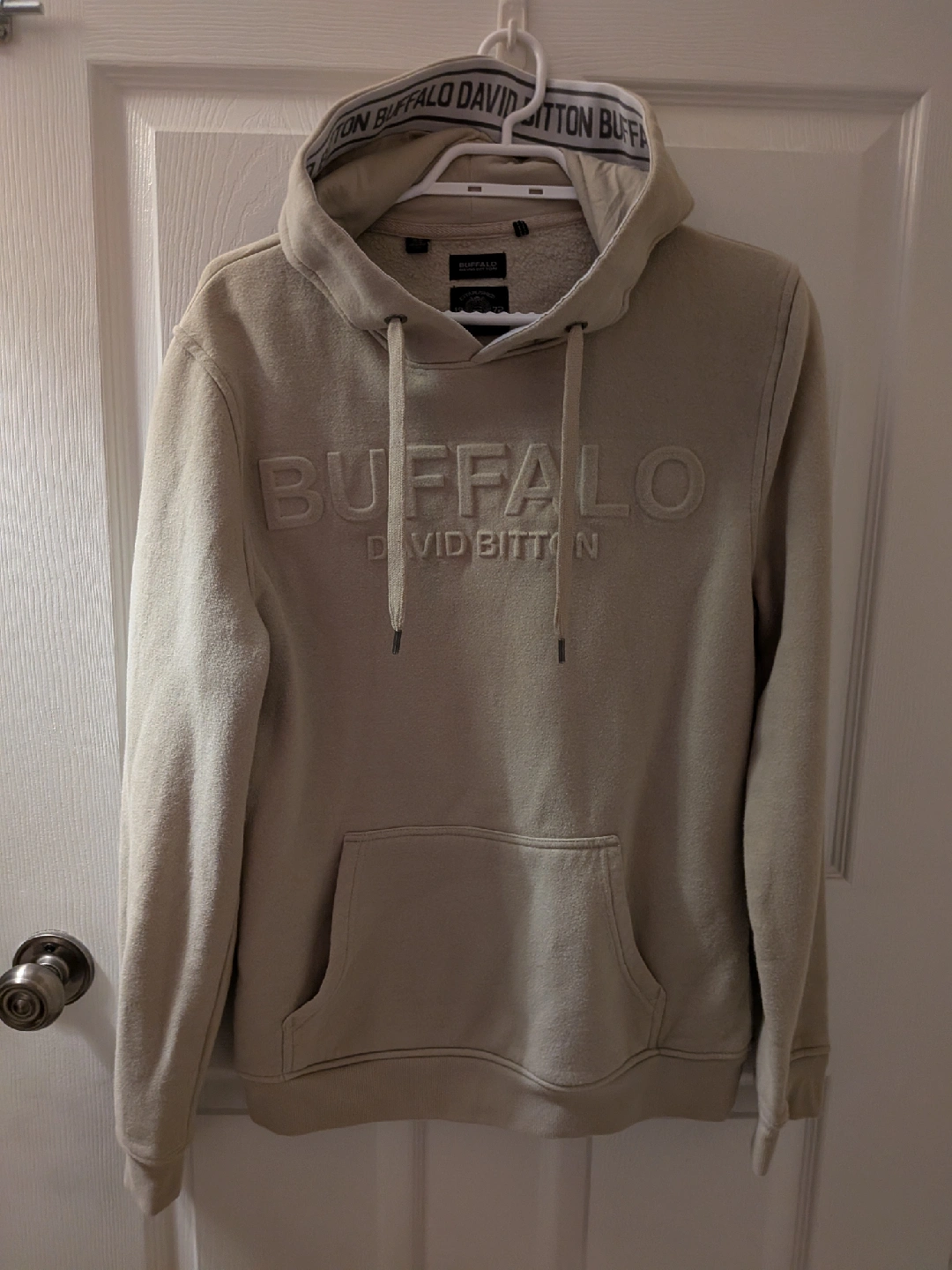 Cozy Buffalo David Bitton hoodie in a neutral colour. It's a size medium and in great condition. Perfect for layering or wearing on its own. The material is soft and comfortable, making it ideal for everyday wear.