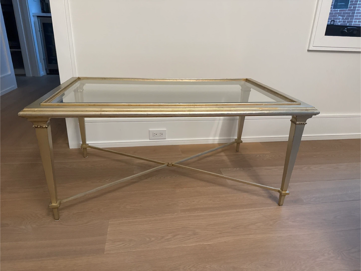 Selling a coffee table with a glass top and a gold-toned frame. It's in great shape and would look lovely in any living room! The neutral colours make it easy to match with any decor. Pick up. Cannot deliver.