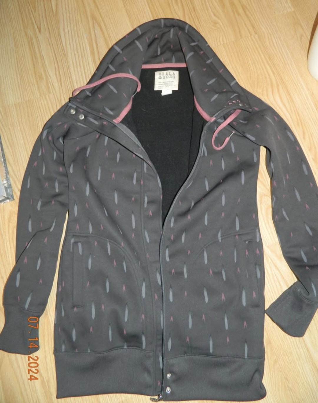 Cozy Billabong zip-up hoodie in a stylish grey colour with a unique pattern. Perfect for layering on cooler days! It features a hood with pink detailing and handy pockets. It's in great condition and ready for a new home
