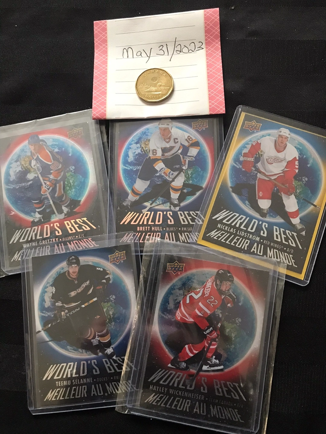 Selling a set of Upper Deck World's Best hockey cards featuring legends like Wayne Gretzky, Brett Hull, Nicklas Lidstrom, Teemu Selanne, and Hayley Wickenheiser. A great addition for any hockey card collector!