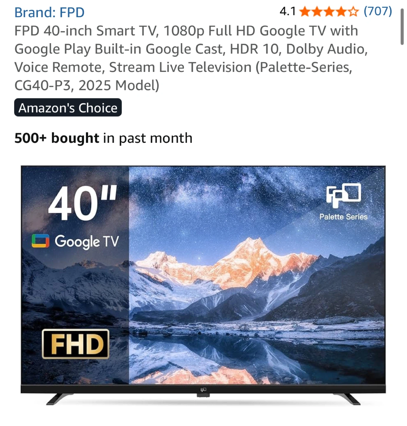 85Selling an FPD 40-inch Smart TV with 1080p Full HD. It's a Google TV with Google Play built-in and has HDR 10 and Dolby Audio. Selling it with the TV Stand (80 degree & 27 to 65 inch)