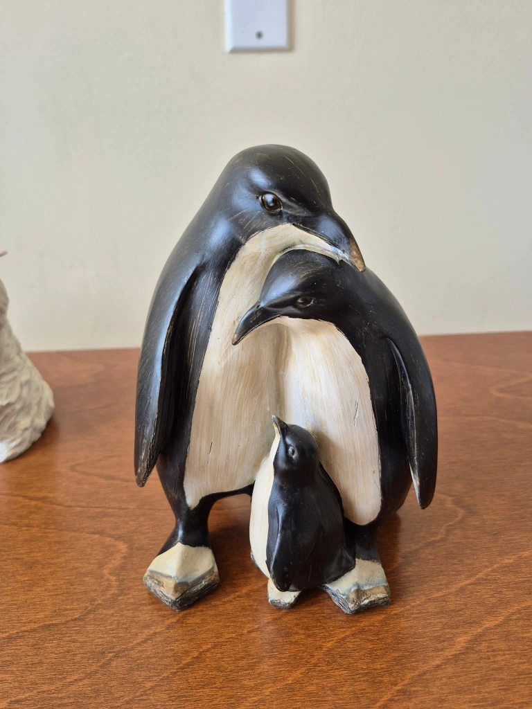 A lovely penguin family figurine, perfect for adding a touch of charm to any room! This piece features a parent penguin with its baby, creating a heartwarming scene. It would look great on a shelf or desk