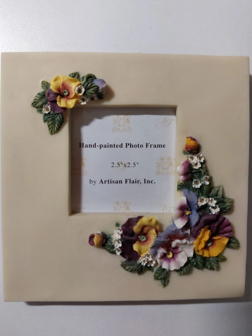 $8 - Here's a lovely hand-painted photo frame by Artisan Flair, Inc! It's perfect for displaying your cherished memories in a unique and decorative way. The frame is 2.5"x2.5" and features beautiful floral accents.