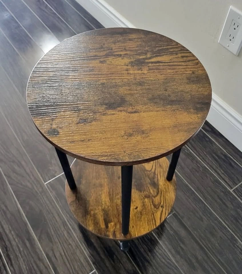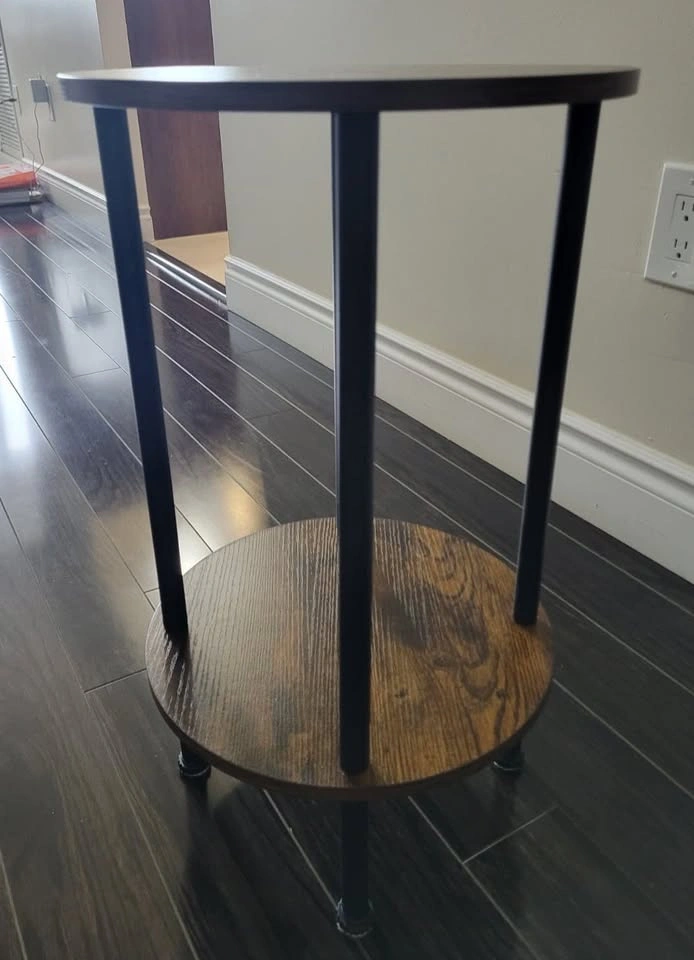 107Beautiful 2-tier round side table / end table with rustic brown wood finish and sturdy black metal frame. Perfect for use as a bedside table, living room accent table, or plant stand. ✅ Stylish industrial design – rustic brown top with black legs ✅ Compact and durable – great for small spaces ✅ Strong metal tube construction for stability ✅ Two-tier design provides extra storage or display space ✅ Ideal for living room, bedroom, or office use Gently used and well maintained — clean, sturdy, and ready to use.