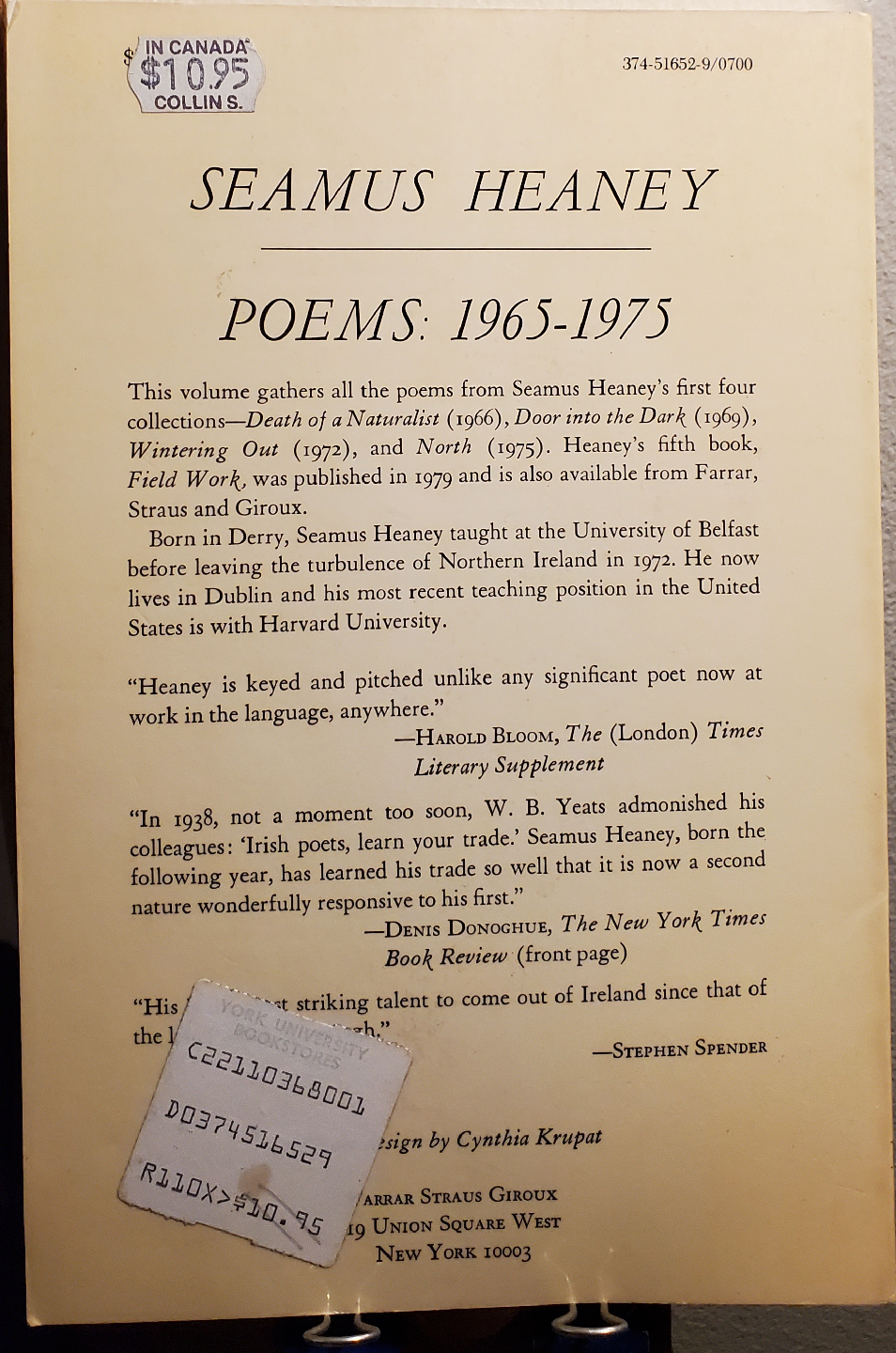 Selling a collection of poems by Seamus Heaney, titled 'Poems 1965-1975'. It includes 'Death of a Naturalist', 'Door into the Dark', 'Wintering Out', and 'North'. A great addition to any poetry lover's collection
