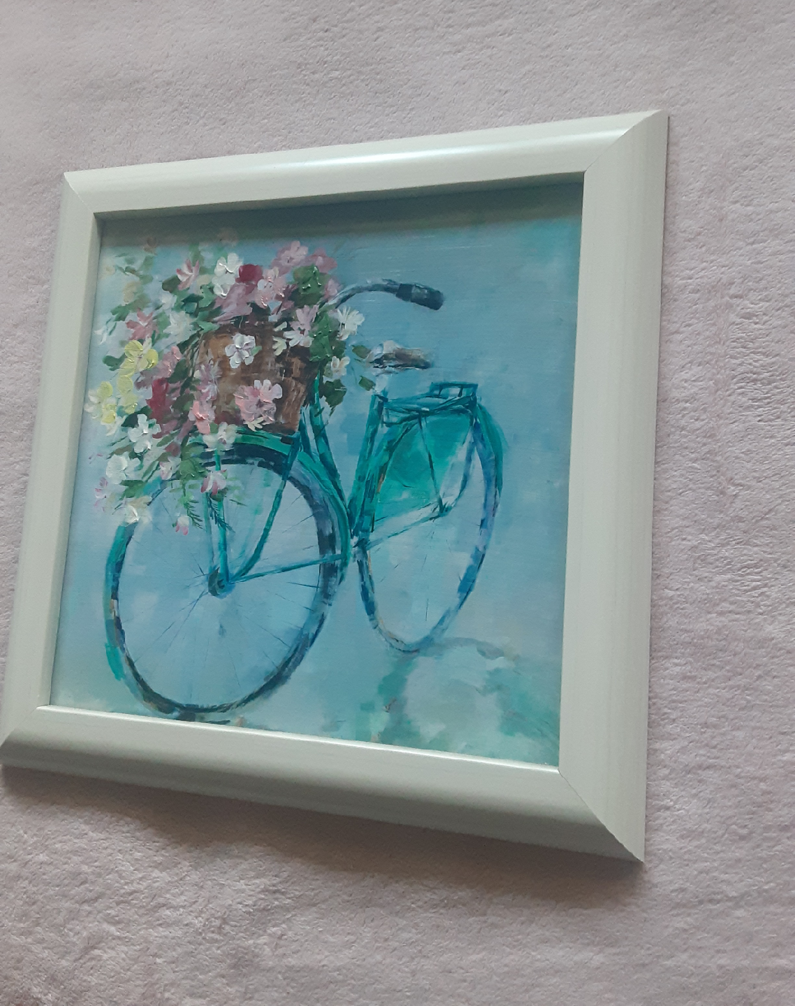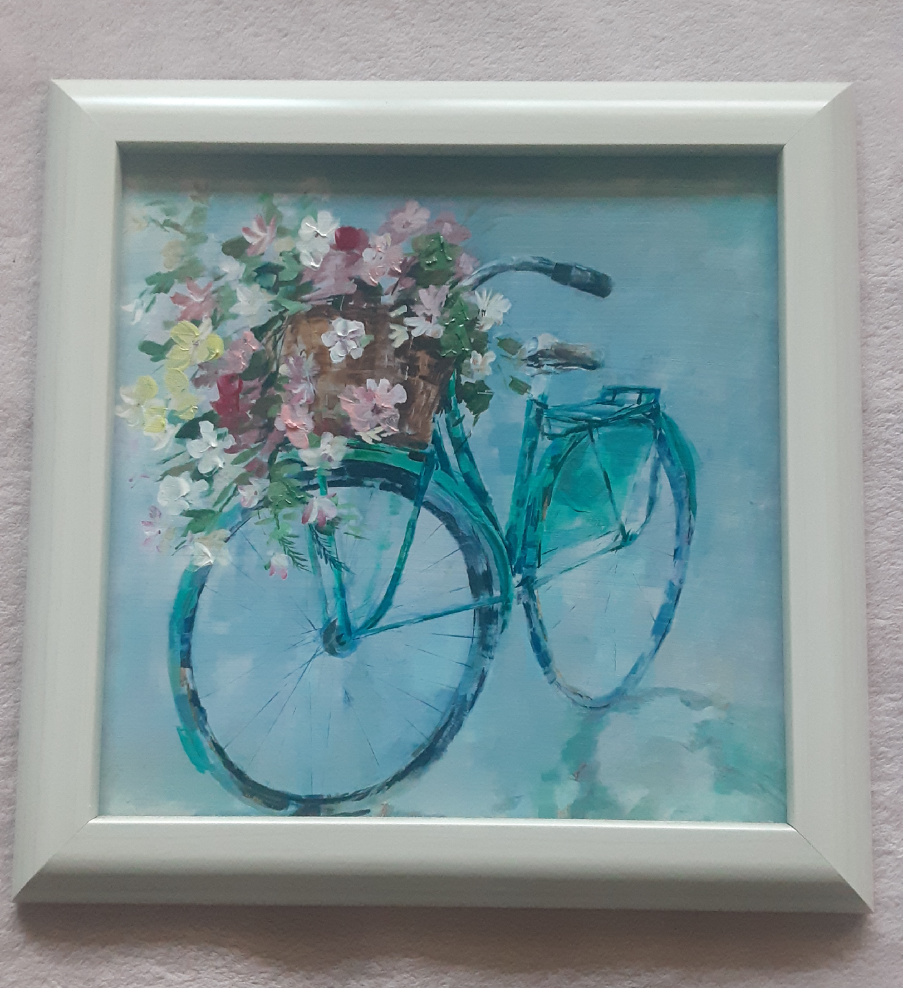 A lovely framed painting of a bicycle with a basket of flowers. The colours are soft and calming, perfect for adding a touch of charm to any room in your home