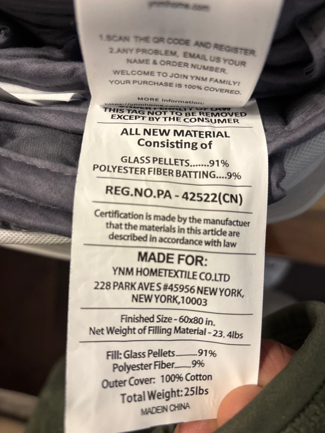 It's made with all new material consisting of 91% glass pellets and 9% polyester fiber batting. The outer cover is 100% cotton. It weighs about 25lbs and comes in the original packaging!