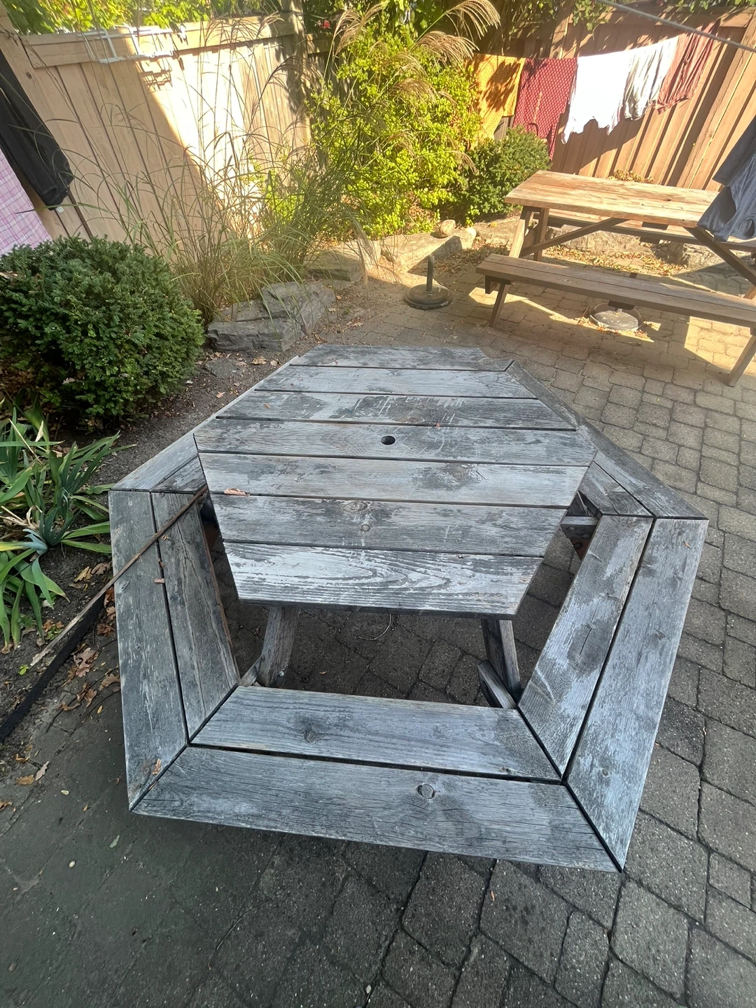 Selling a wooden outdoor table. It has a unique hexagonal shape with built-in seating around the perimeter. Perfect for enjoying meals or gatherings in your backyard or patio