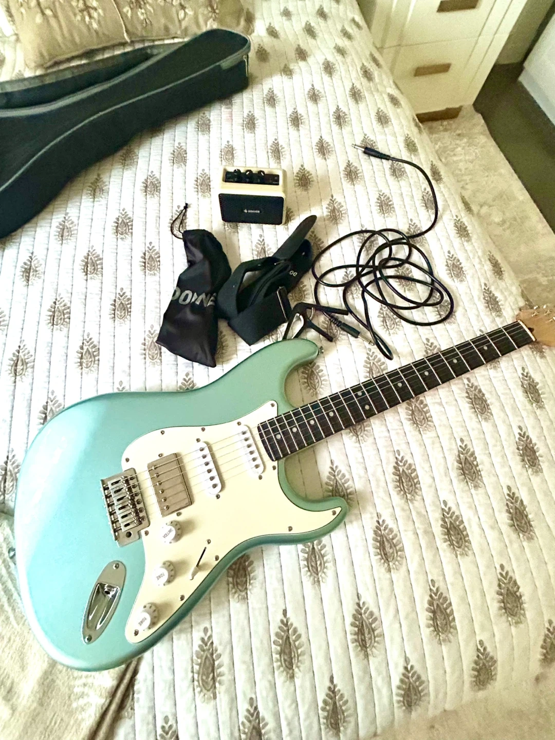 Selling a beautiful DONNER electric guitar! Gorgeous blue tone. Comes with amp, shoulder strap, and guitar picks!❤️
