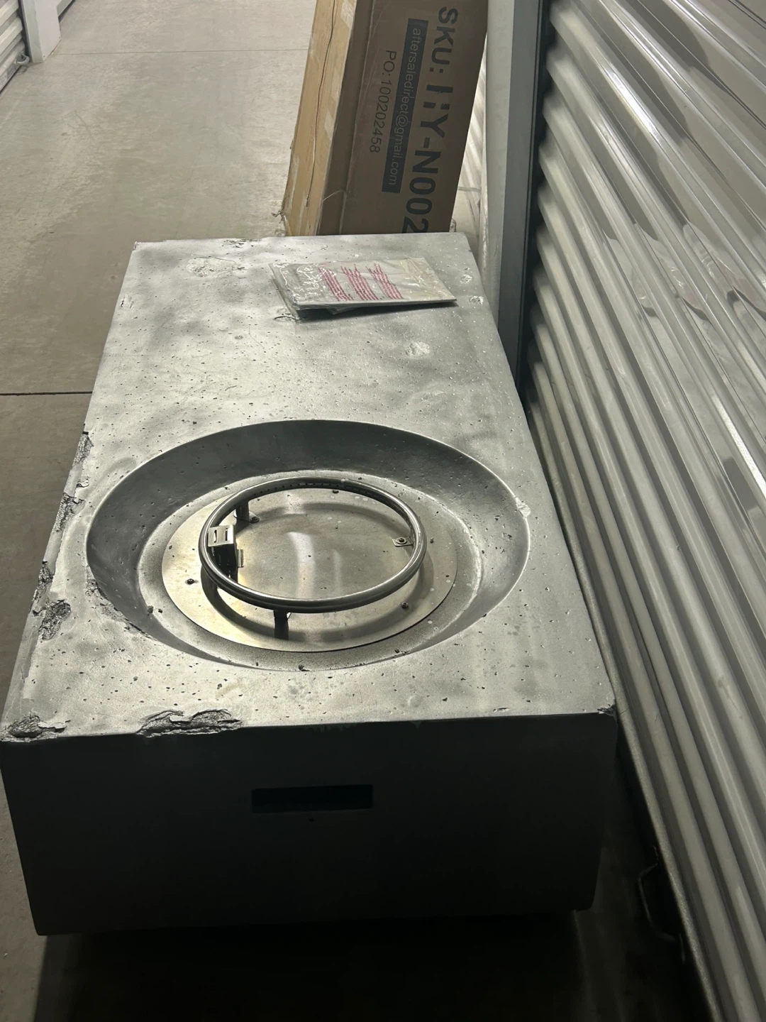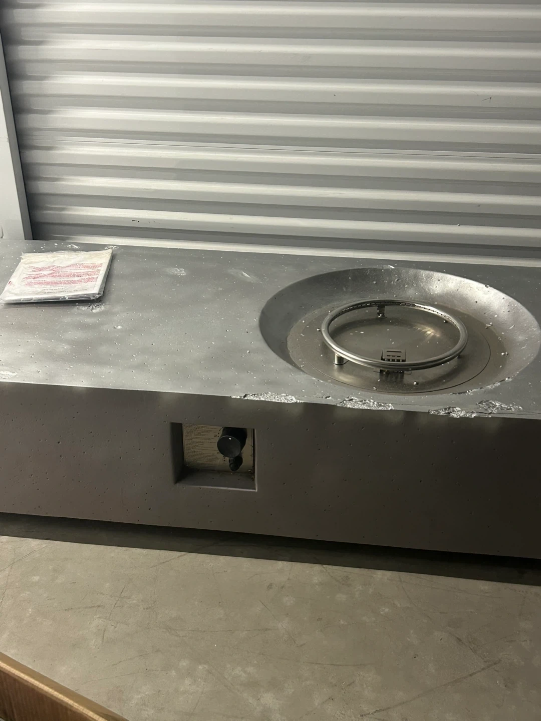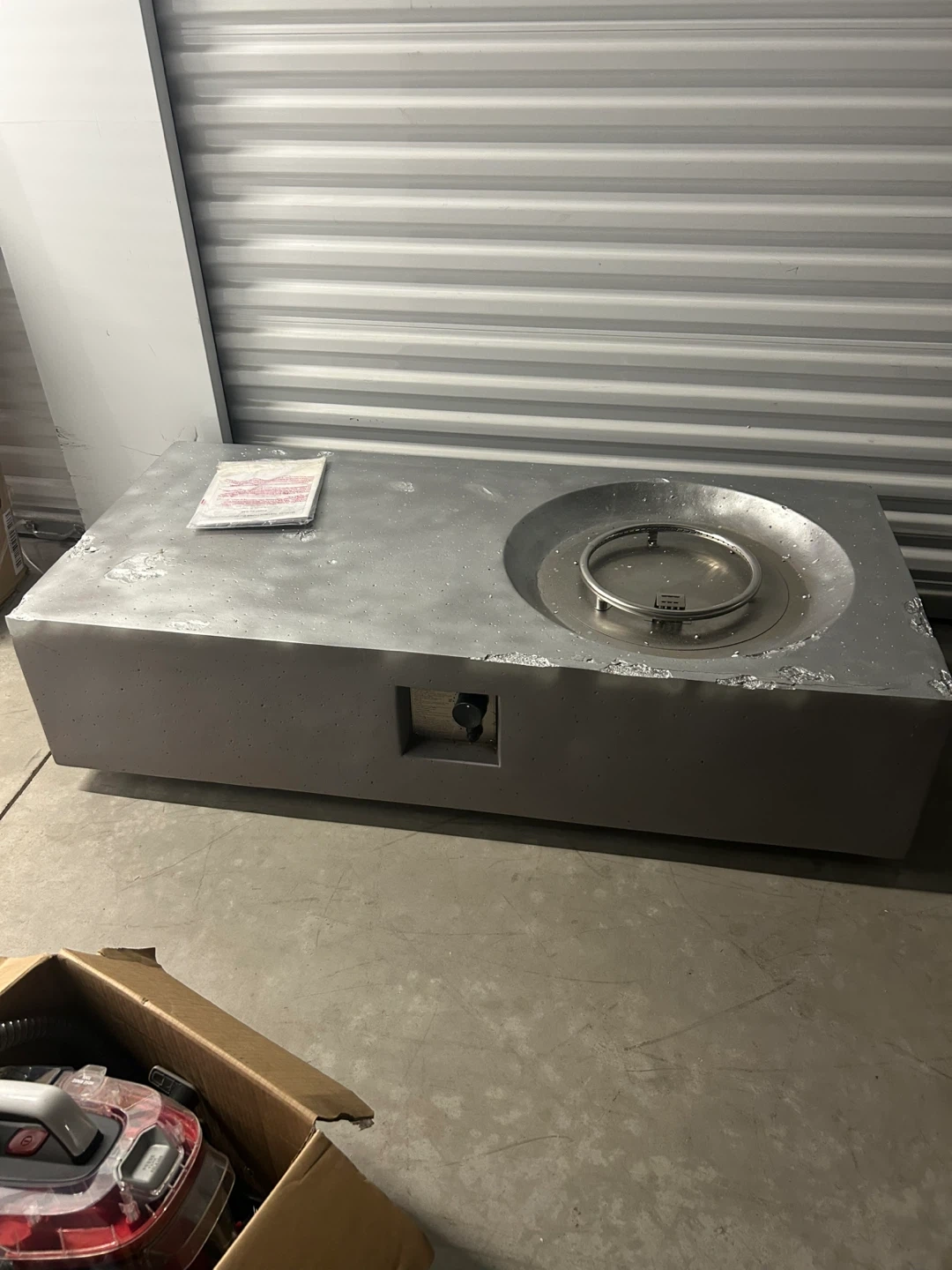 Selling an outdoor concrete fire pit table. It has a modern look and is perfect for your backyard or patio. It's in good condition and ready to use for those cozy evenings!