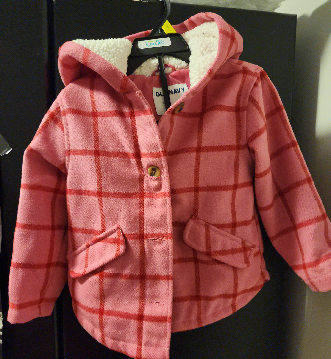 Here's a cute Old Navy hooded coat for your little one! It features a pink and red plaid pattern with a cozy sherpa lining in the hood. Perfect for keeping them warm and stylish! size 2t