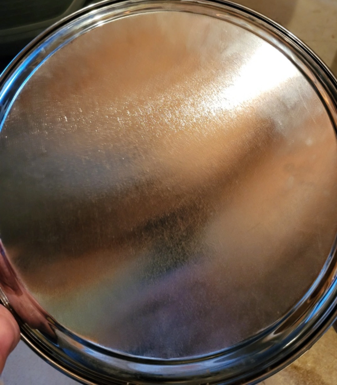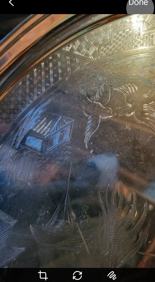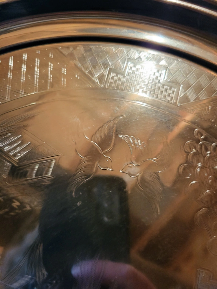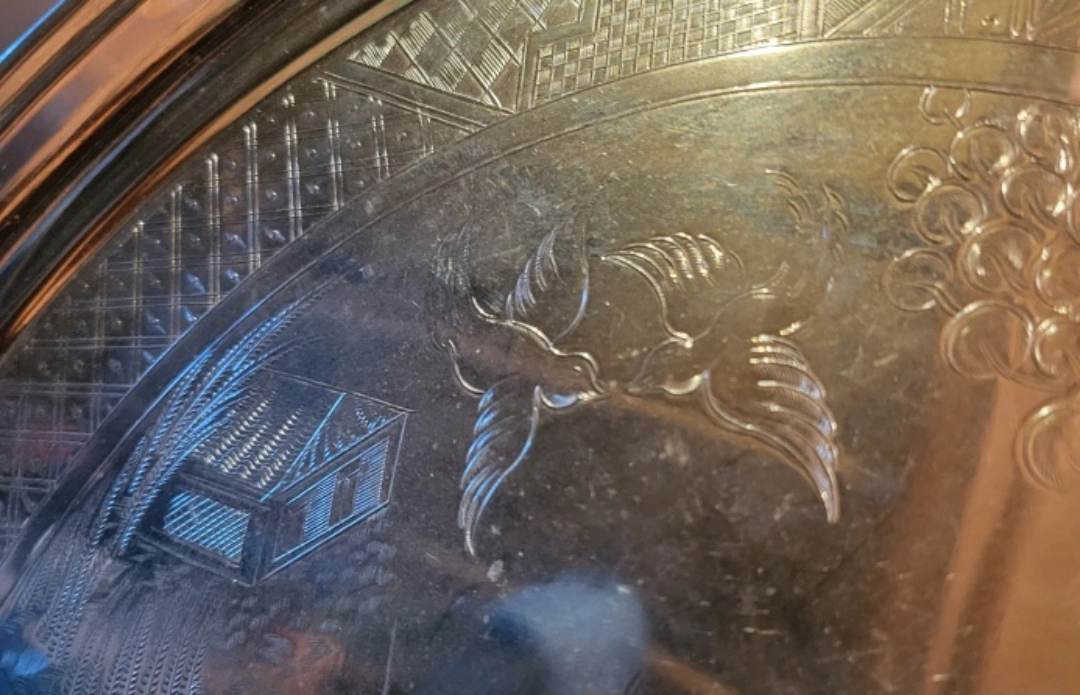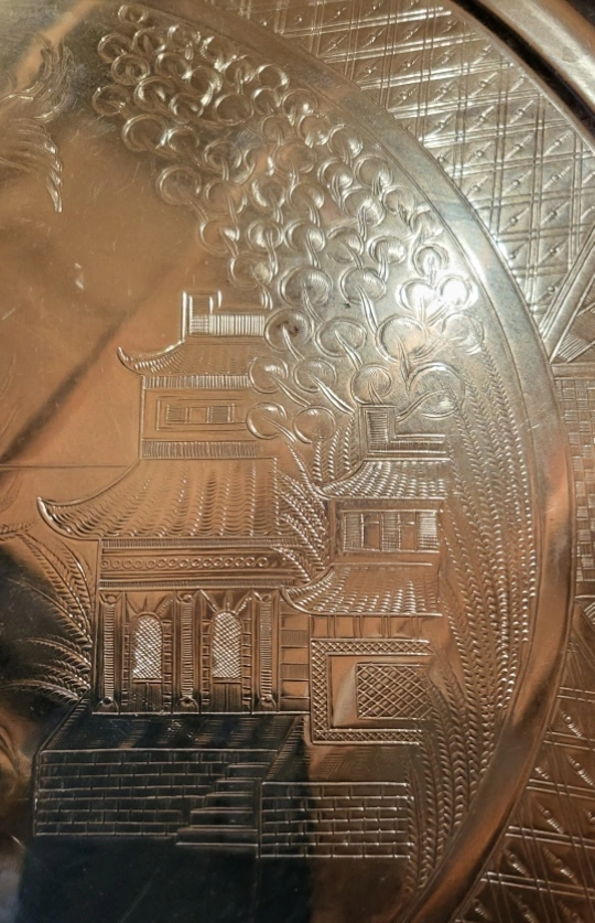 134Selling a decorative Chrome Plate tray with an etched design. It features buildings, birds, and other intricate details. It would make a lovely addition to any home! Large 14" diameter