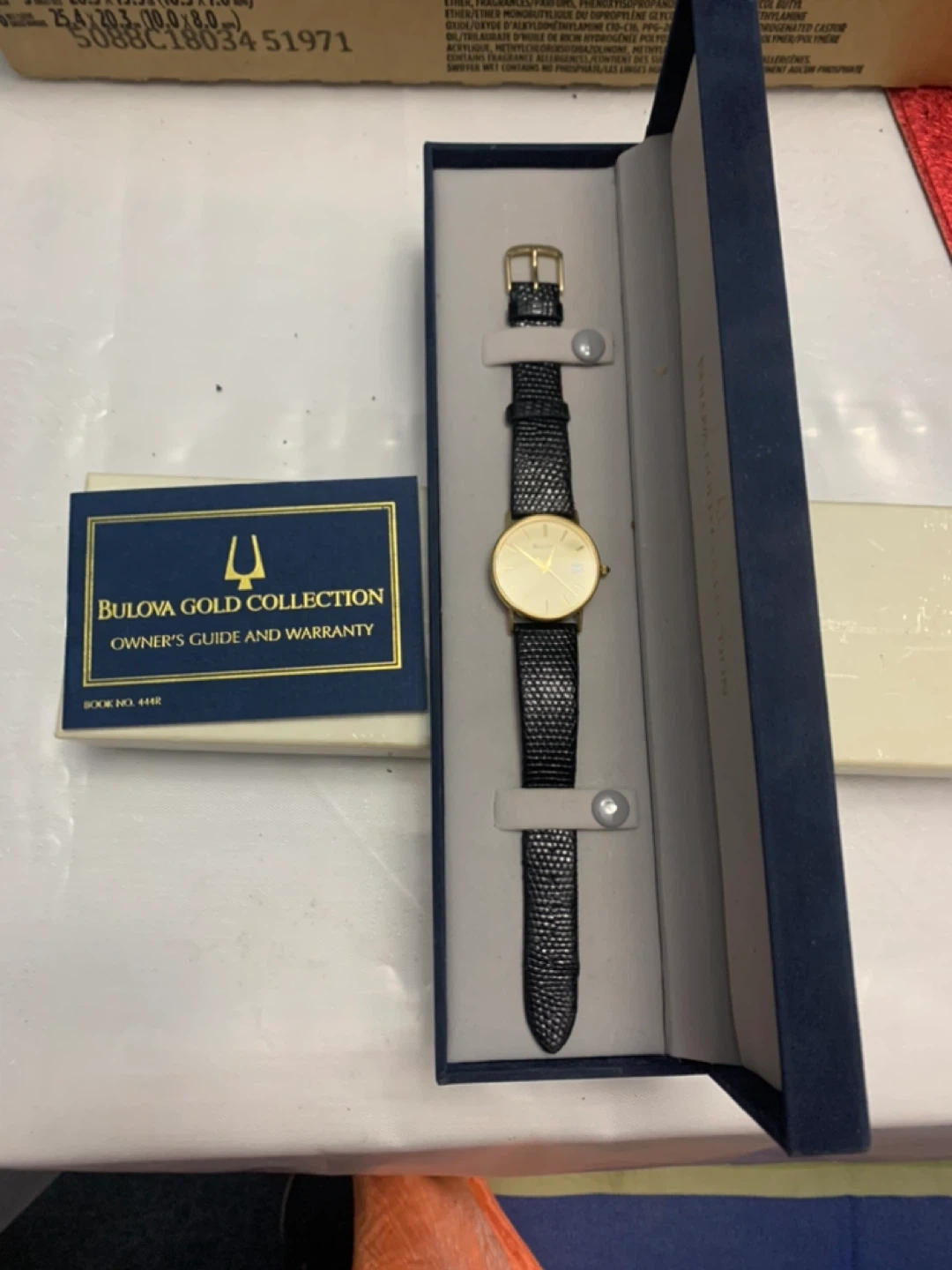 Bulova Gold Collection watch with a black band. It comes with the original box and owner's guide and warranty. Originally $1200 and never worn!