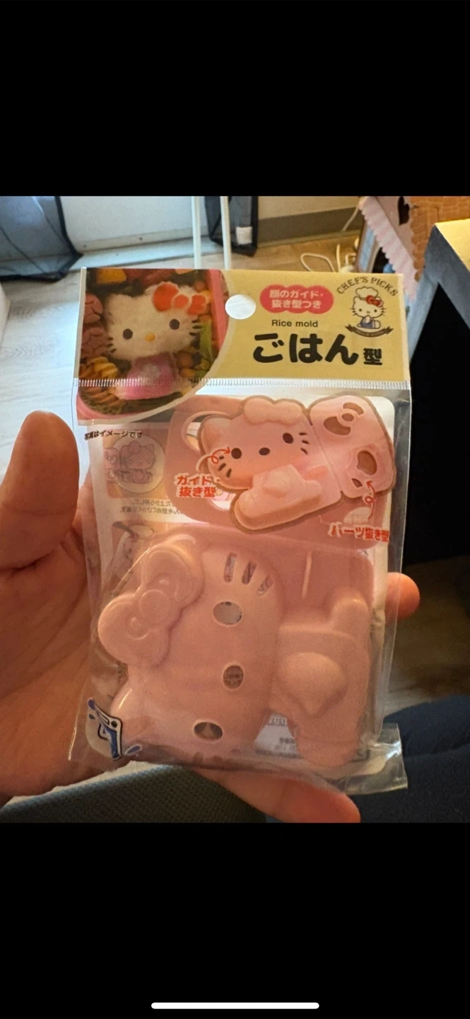 Chef's Picks Hello Kitty rice mold. It's a super cute way to make fun lunches and snacks! The packaging includes instructions and shows an example of how to use the mold to create a Hello Kitty-shaped rice dish