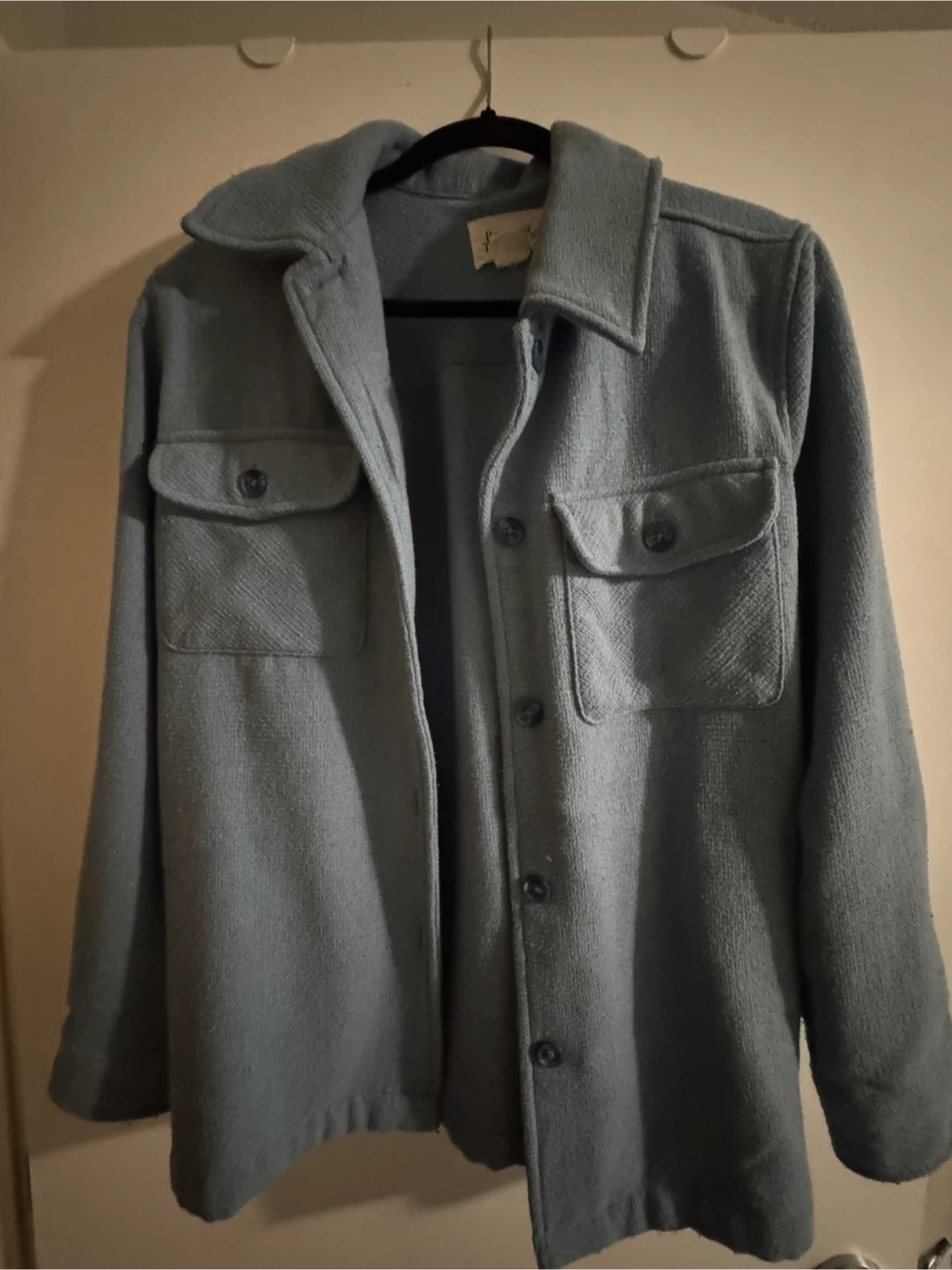 Selling a stylish shirt jacket in a lovely blue colour! It's made from a wool blend and features a classic design with chest pockets and button-up closure. Perfect for layering during the cooler months!
