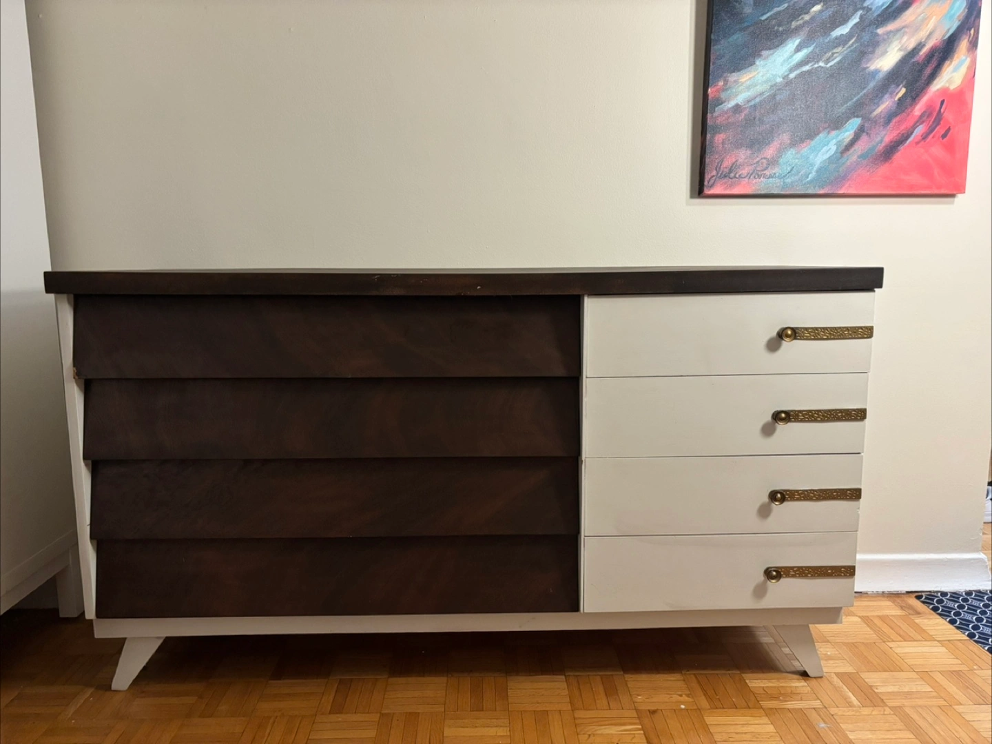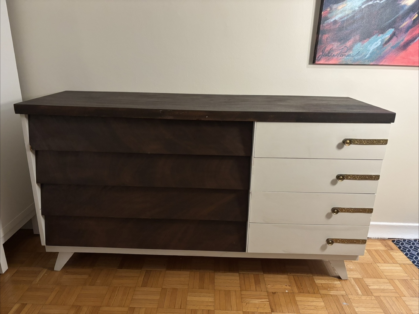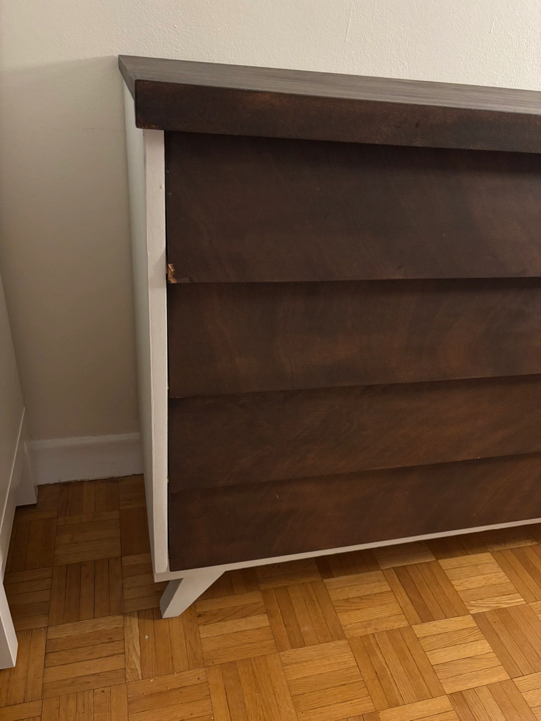 Here's a dresser with a unique design! It features a dark brown top and left side, contrasted by a white right side and base. It has a few drawers for storage, perfect for organizing your clothes and other belongings. There's a bit of wear on the top left corner, but it's still in good condition overall