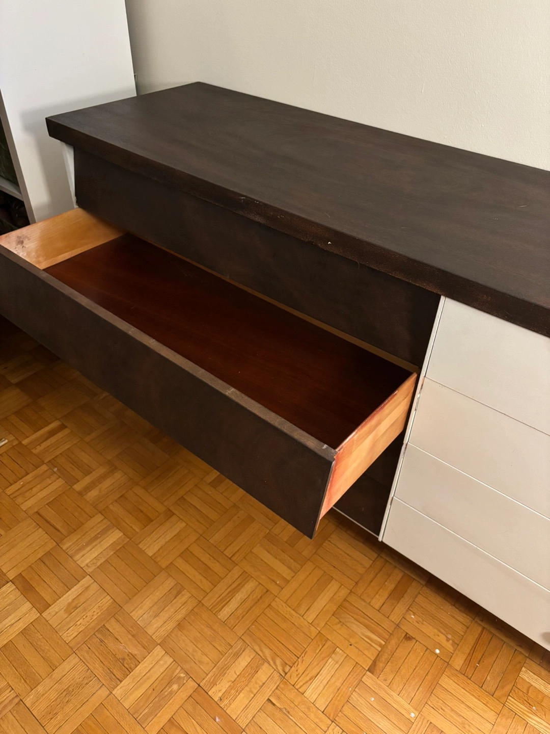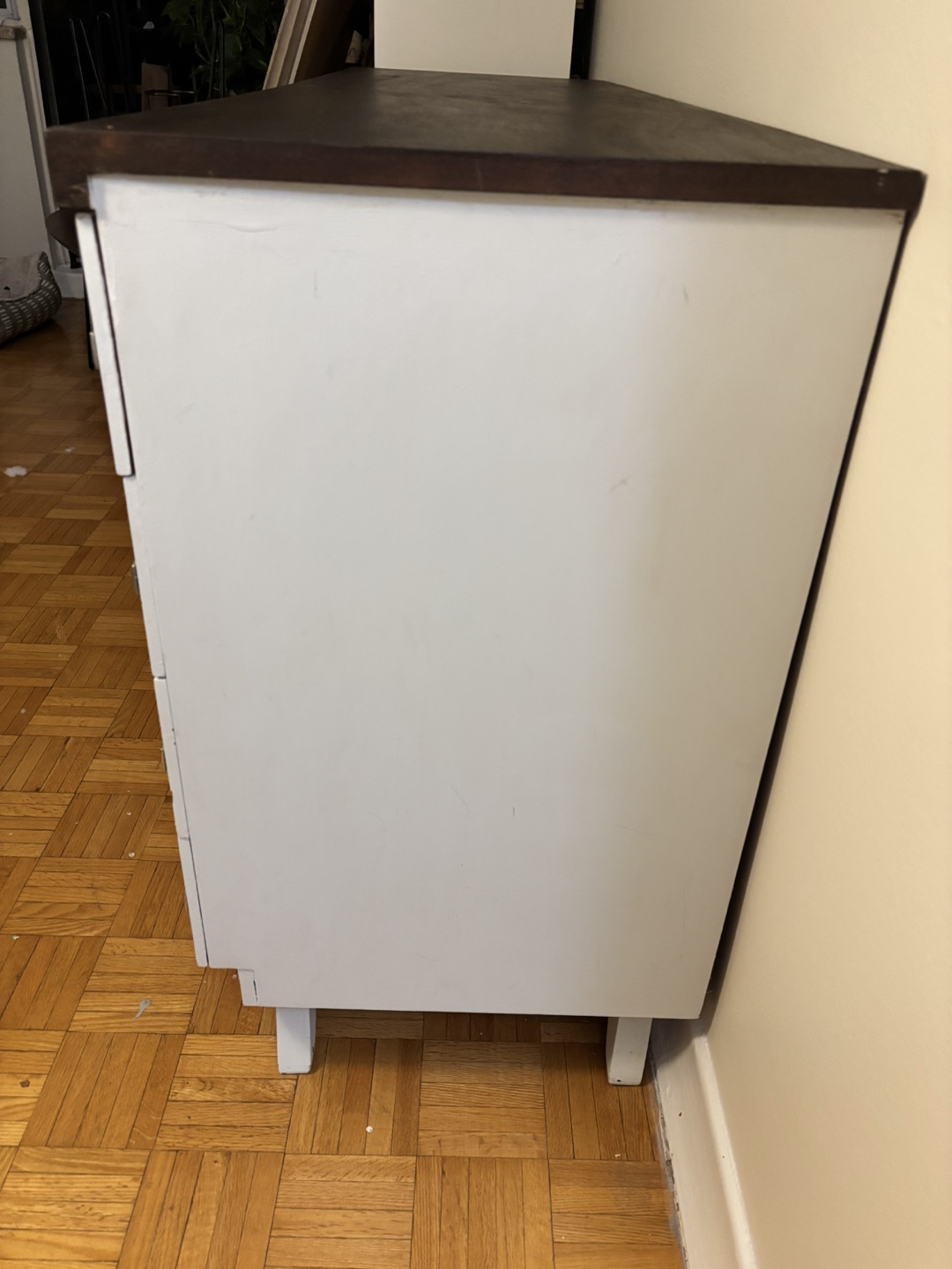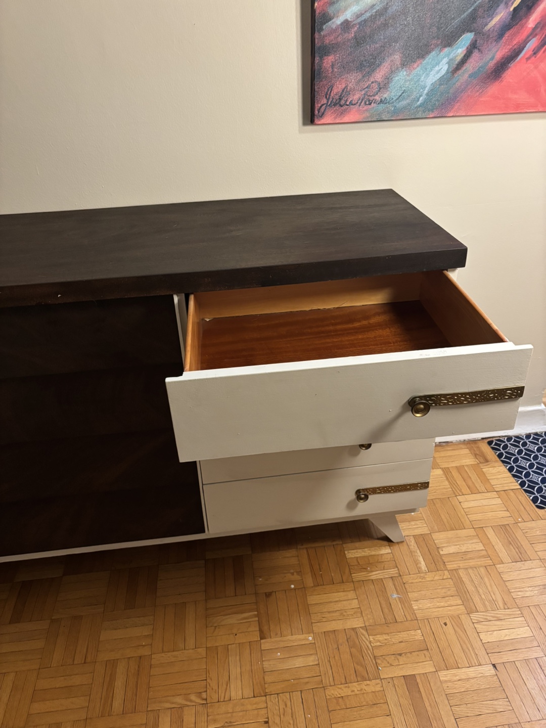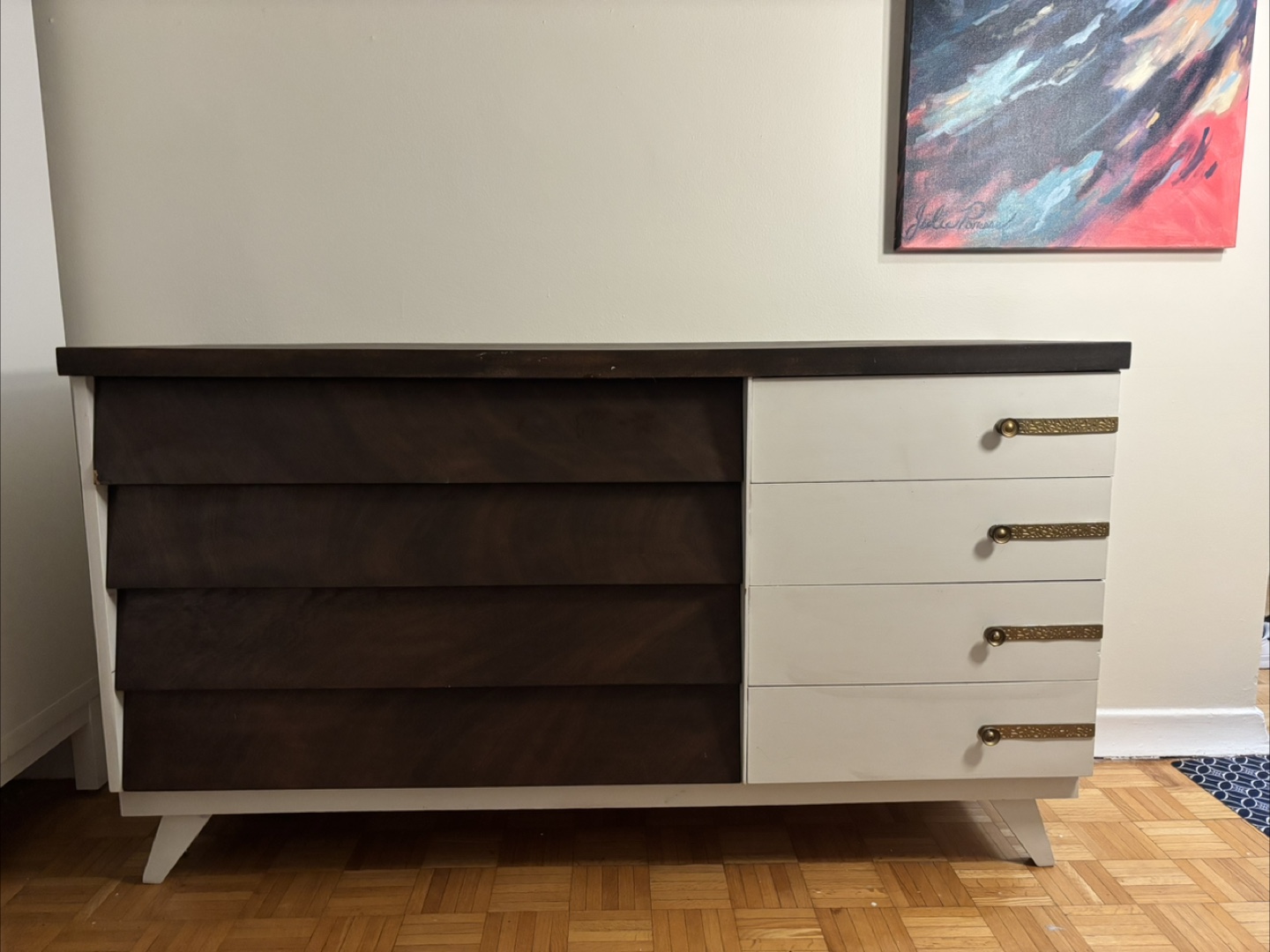 Here's a dresser with a unique design! It features a dark brown top and left side, contrasted by a white right side and base. It has a few drawers for storage, perfect for organizing your clothes and other belongings. There's a bit of wear on the top left corner, but it's still in good condition overall