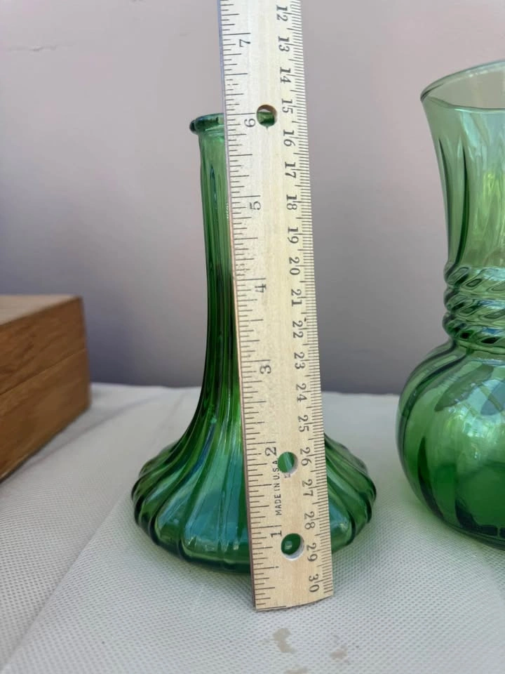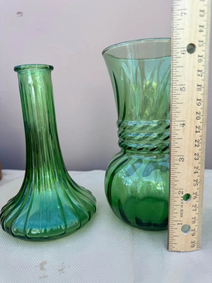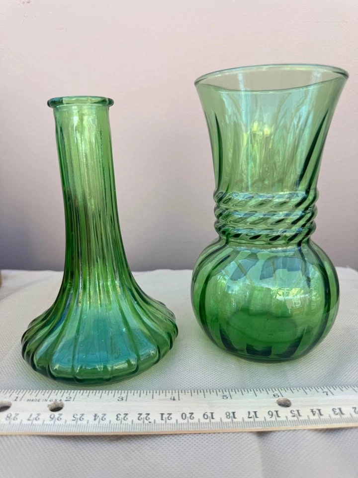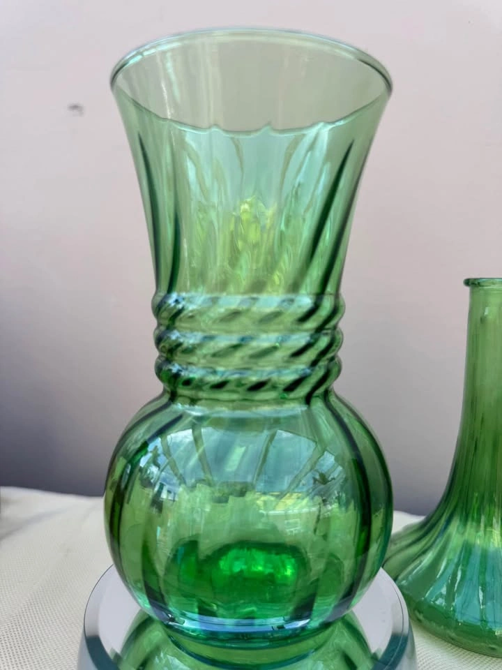Two small green glass vases. Price is for both. Gorgeous filled with beautiful spring flowers. Both are under 7 inches tall. Birchmount and Kingston Road area.