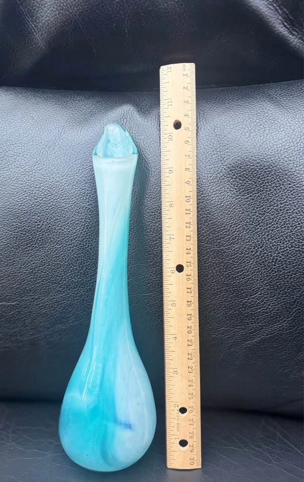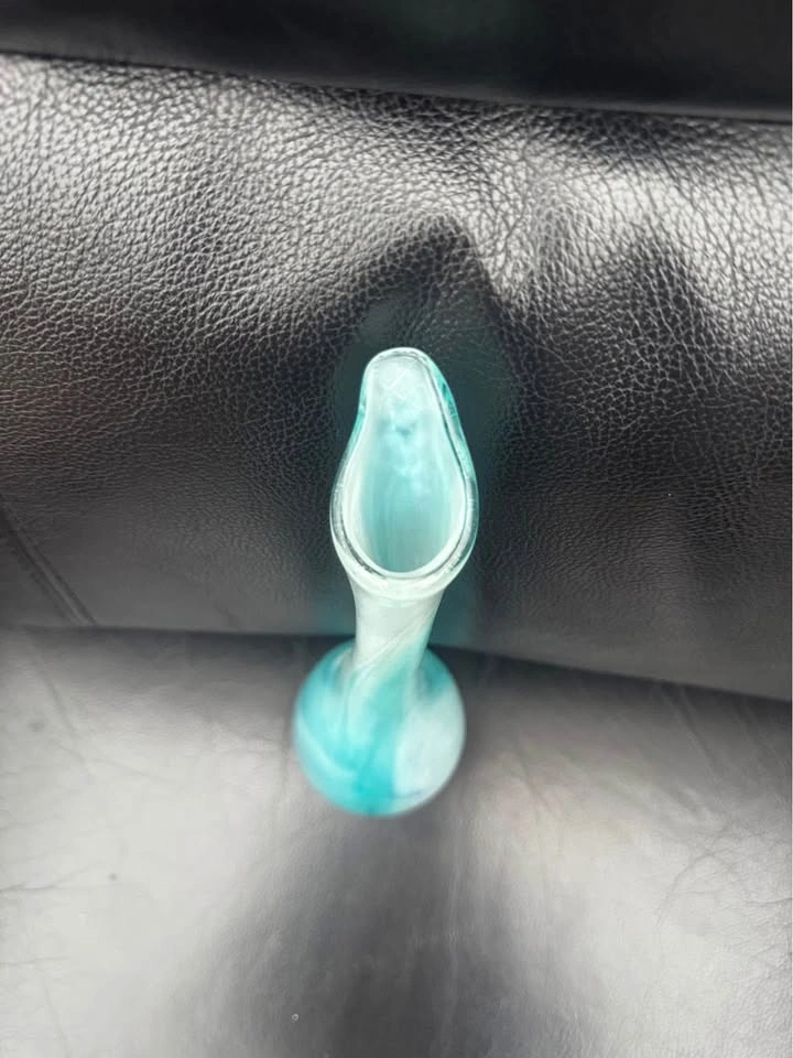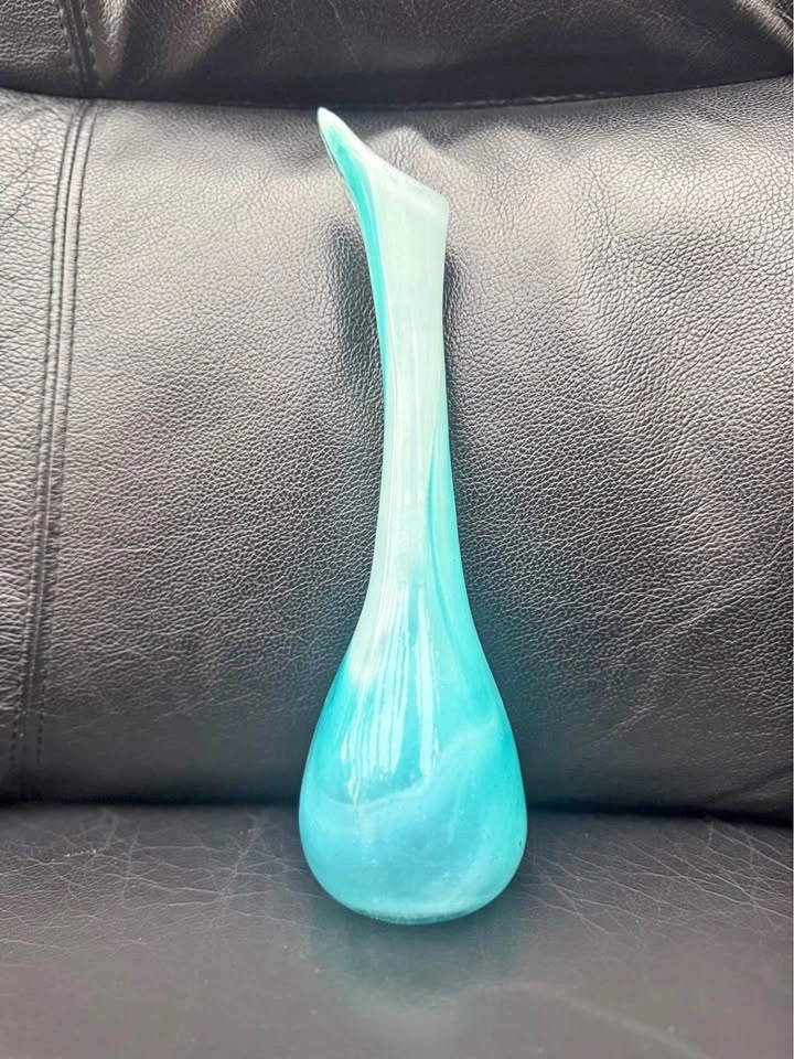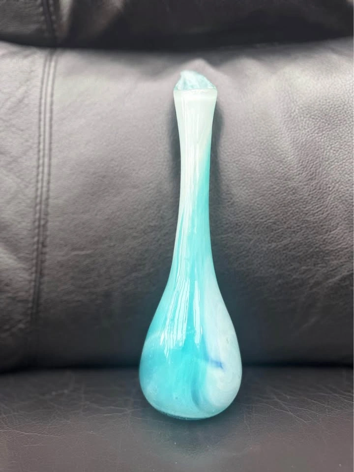 Beautiful glass bud vase with aqua and white swirls in varying intensities throughout. Approximately 10 inches tall. Pick up in the Birchmount Road and Kingston Road area.
