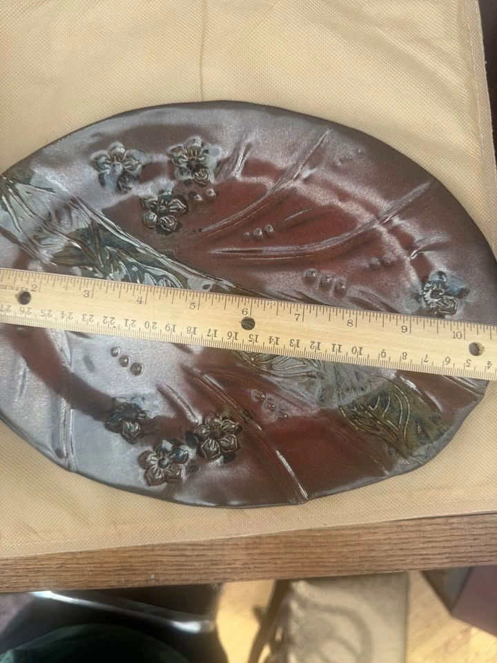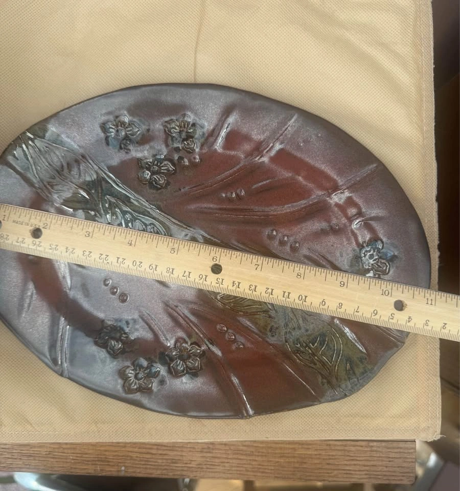 Extra special details on this unique little platter/plate. Hand crafted artistically and signed. Measures approximately 11 inches by 7.5 inches.