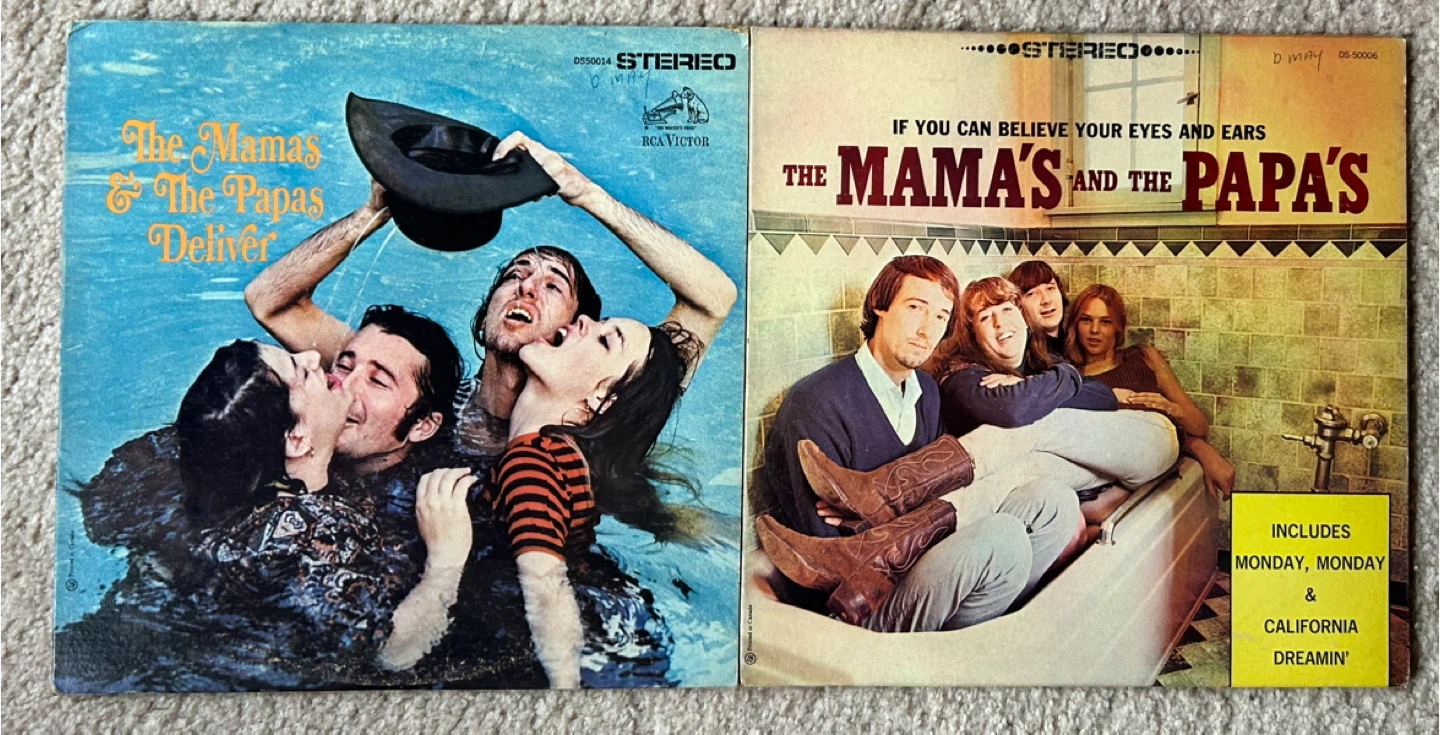 Selling two vinyl records by The Mamas & The Papas: 'Deliver' and 'If You Can Believe Your Eyes and Ears'. Both are stereo recordings and include the songs 'Monday, Monday' and 'California Dreamin'