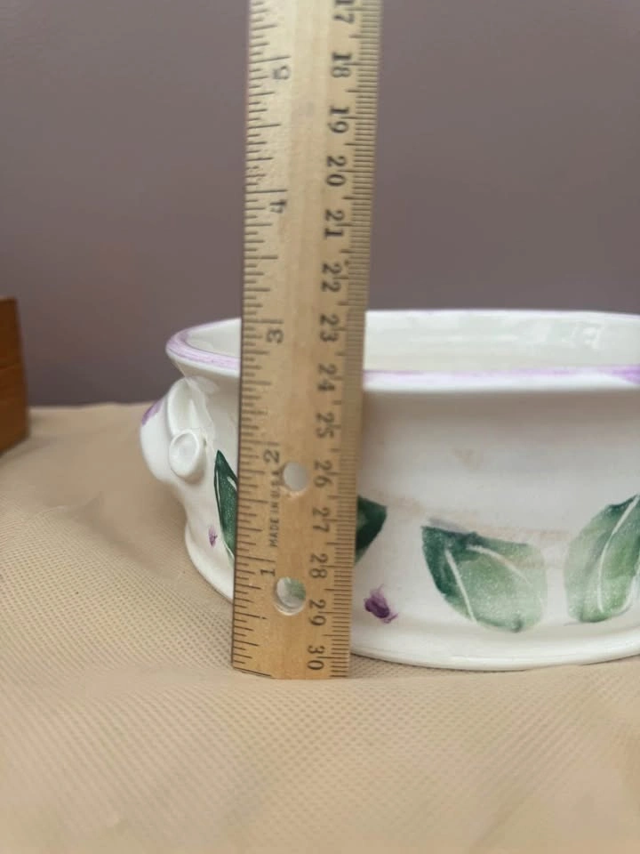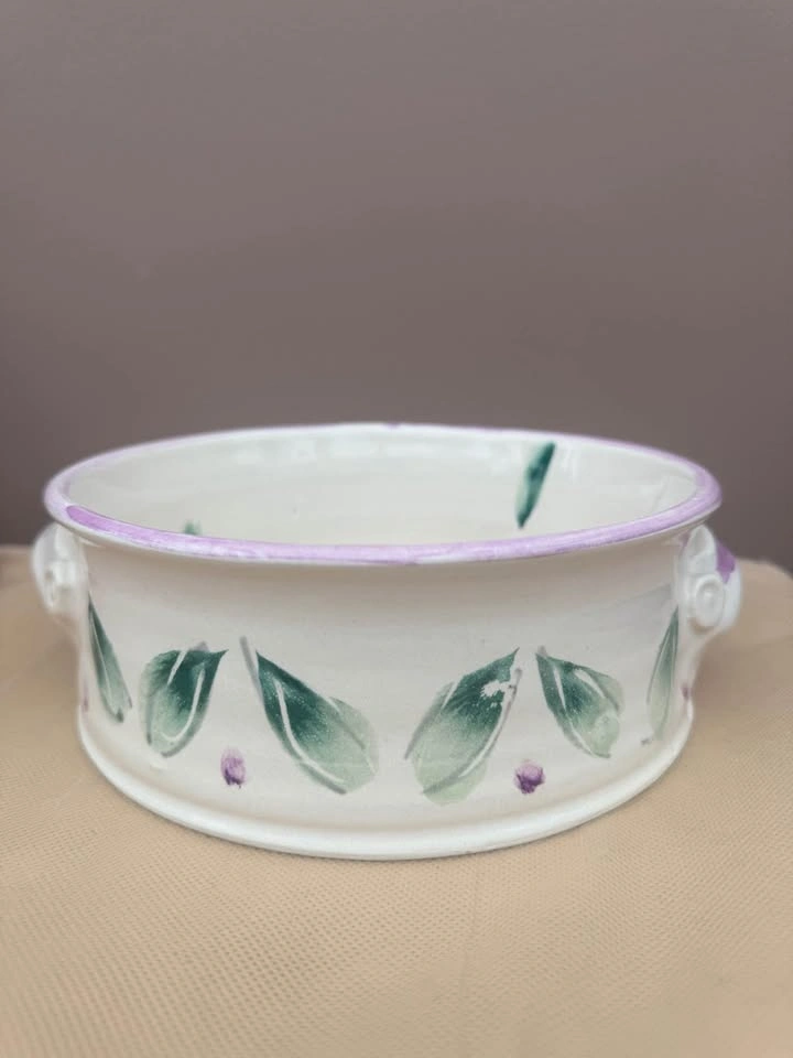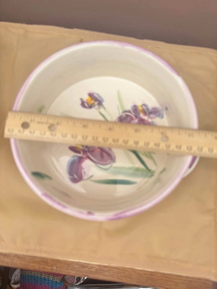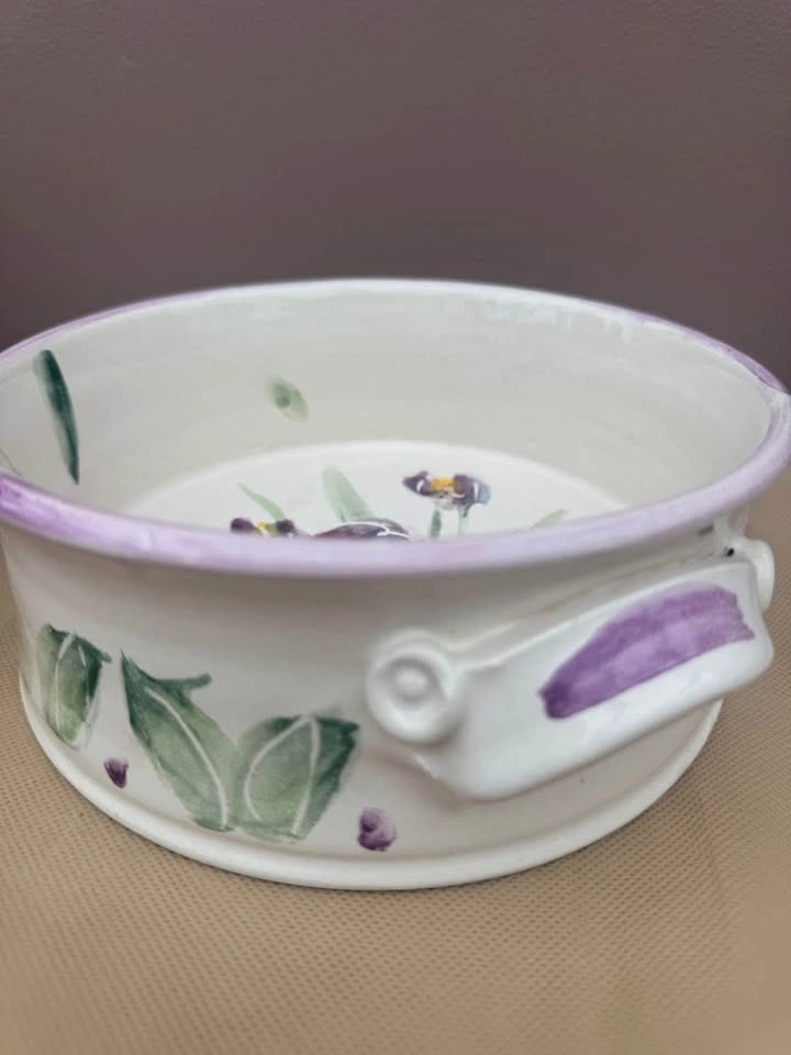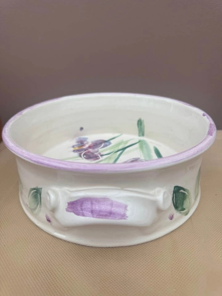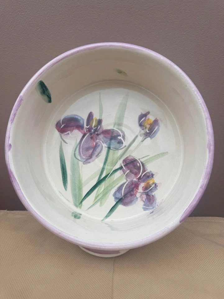 Beautiful and unique hand painted open casserole was signed by the potter. Beautiful irises adorn the bottom, a true work of art. This dish is about 7 inches across and 3 inches tall. It would make a wonderful gift. Great bowl for serving or casseroles. Cash only please. No holds. Birchmount and Kingston Road area.